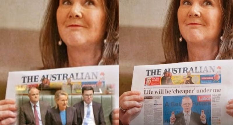 The image, shown in the program’s opening montage, depicted the Liberal senator holding The Australian newspaper with three of her Coalition colleagues on the front page.