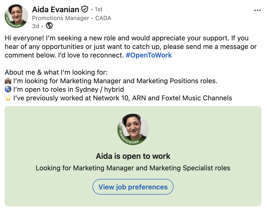 “Hi everyone! I’m seeking a new role and would appreciate your support. If you hear of any opportunities or just want to catch up, please send me a message or comment below. I’d love to reconnect.”