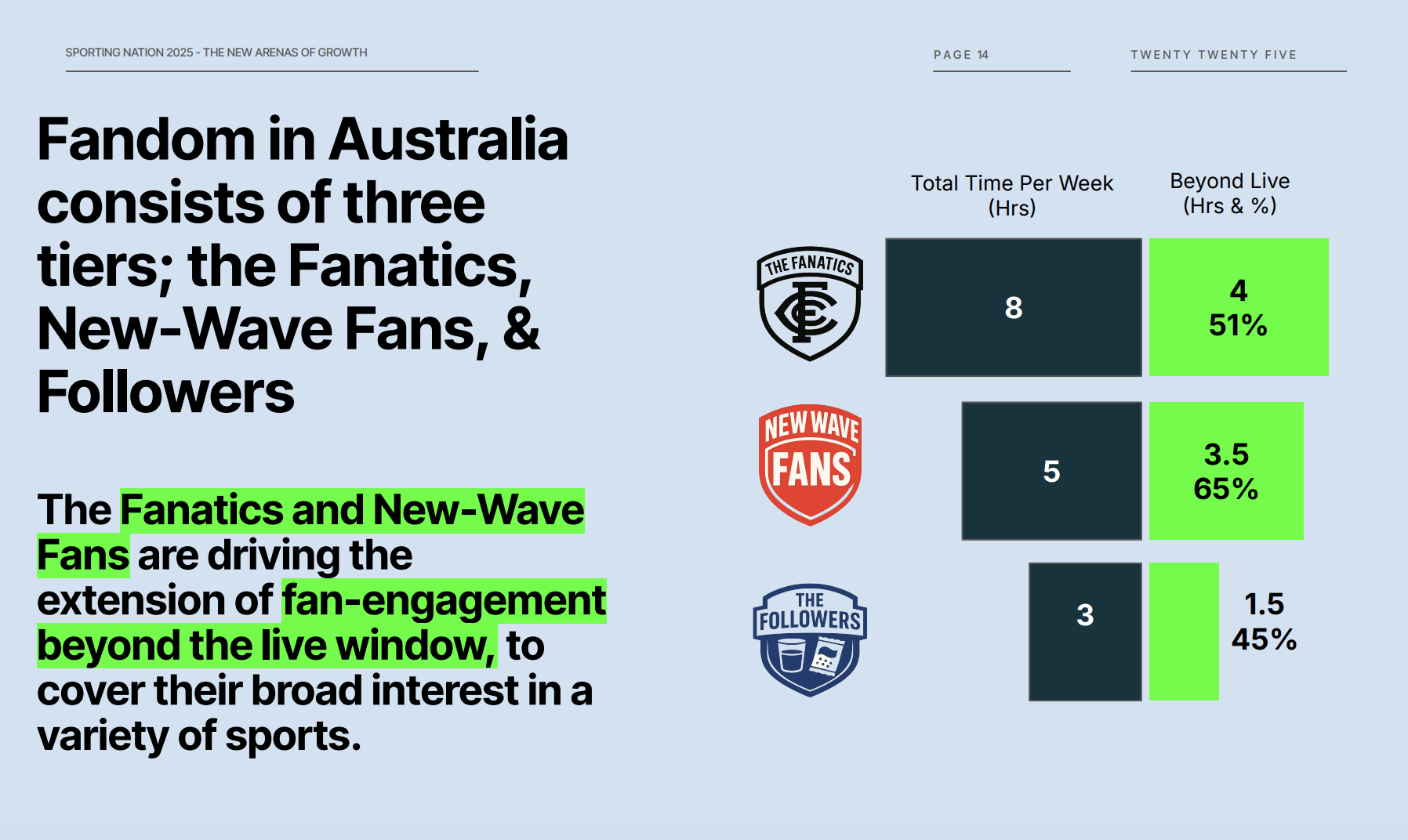 The study also outlines three types of modern sports fans: Fanatics, who live and breathe their chosen sport; New-Wave Fans, who are digital-first and follow both local and global codes; and Followers, the casual crew who tune in mainly for the social buzz.