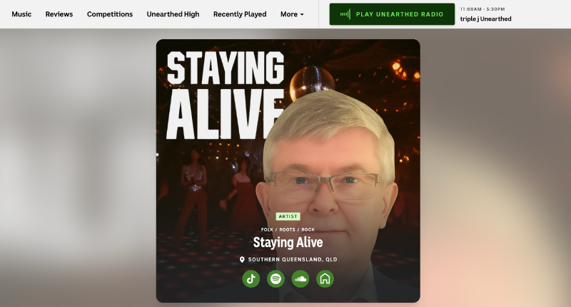 Hi profile reads: “Staying Alive is the voice of modern rebellion — an Australian songwriter and truth-teller blending folk grit, spoken-word fire, and raw protest energy. From acoustic anthems to cinematic storytelling, each track challenges the narratives that keep people silent, sick, or asleep.