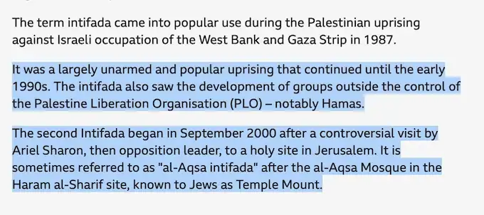 In explaining the origins of the term, the BBC said “intifada” came into popular use during the Palestinian uprising against Israeli occupation of the West Bank and Gaza Strip in 1987, adding that it was “a largely unarmed and popular uprising that continued until the early 1990s”.