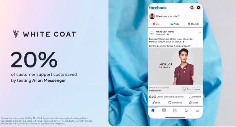 A real-world example comes from Philippines-based medical apparel brand White Coat Manila, which deployed business AI on Messenger to answer customer questions and guide users directly to cart – delivering a 20% drop in support costs and a 5% uplift in customer conversations.