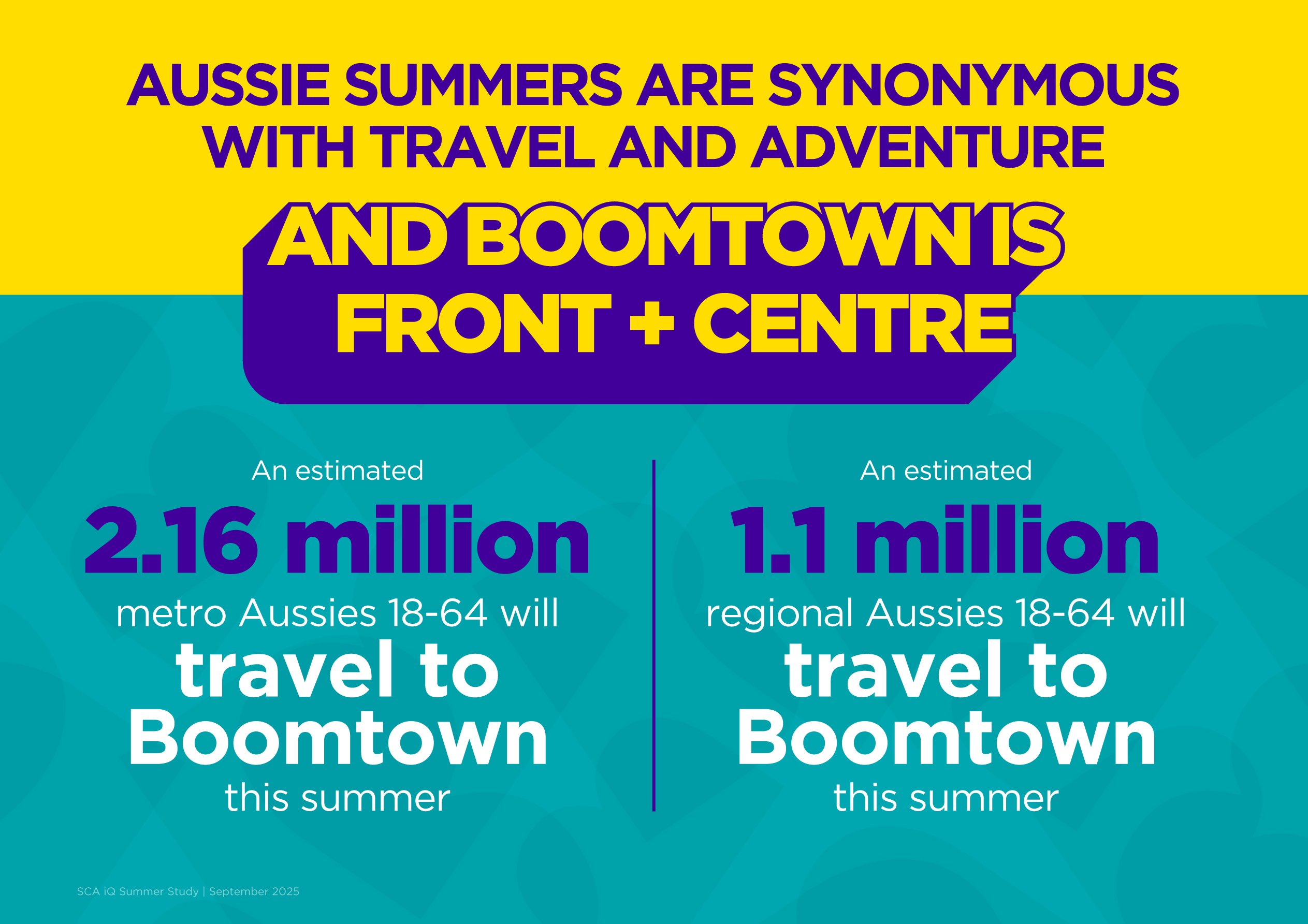 The Boomtown and SCA iQ Summer Travel Study, conducted in August and September among 1,600 Australians aged 18-64, found that 47 per cent of metropolitan travellers and 74 per cent of regional residents intend to holiday in Boomtown this summer. That represents 2.16 million metro holidaymakers and 1.1 million regional travellers, up from 65 per cent last year.