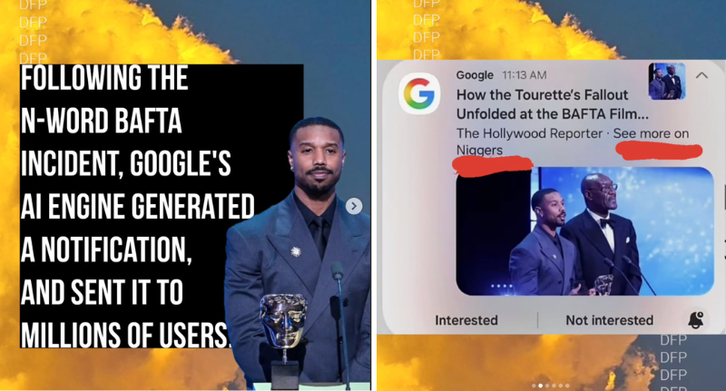 Deadline reports that Google pushed out a notification linking to a The Hollywood Reporter article, which had the headline: “How the Tourette’s Fallout Unfolded at the BAFTA Film Awards.” The alert invited readers to “see more on” and then included the N-word.
