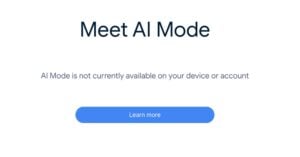 Efforts by Mediaweek to use the service resulted in a message advising that AI Mode was “not currently available on your device or account.” This is a 2023 Macbook with Chrome installed.