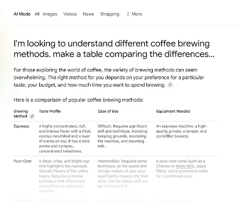 AI Mode empowers Google users to ask longer and more complex questions. The search giant has said that this functionality is useful for “exploratory tasks like planning a trip, or understanding complex how-tos.” In a Google blog on the local launch, Google offered up the example search: ”I want to understand the different coffee brewing methods. Make a table comparing the differences in taste, ease of use, and the equipment needed.” And to follow it up with: “What’s the best grind size for each method?”
