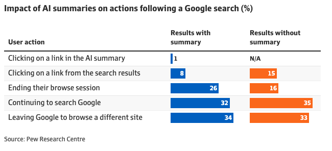 In July, the US think tank Pew Research Centre found that when users were given a quality AI Overview after searching on Google, clicks to the primary source of the information were substantially lower: