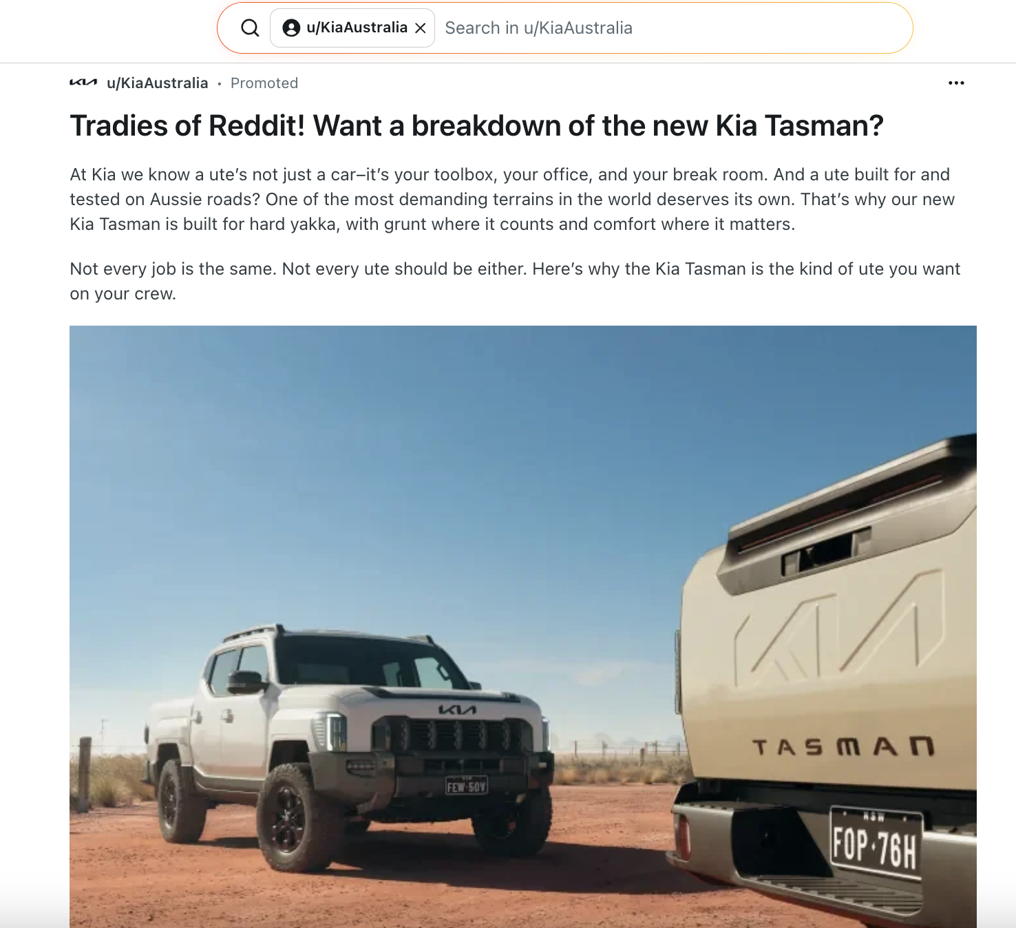 Kia had previously experimented with Reddit through category buys, but the Tasman campaign marked a turning point in how the platform was used.