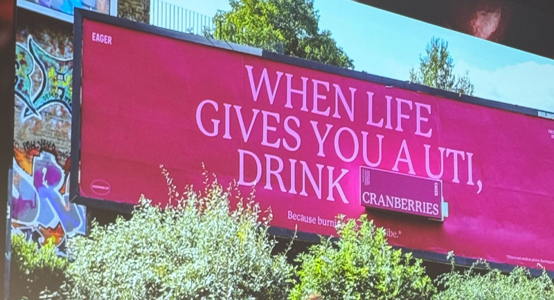During UK university Fresher’s Week, the first week at university, their cranberry juice campaign declared: “When life gives you a UTI, drink cranberries.” And the tagline read, “Because burning pee isn’t a vibe.”
