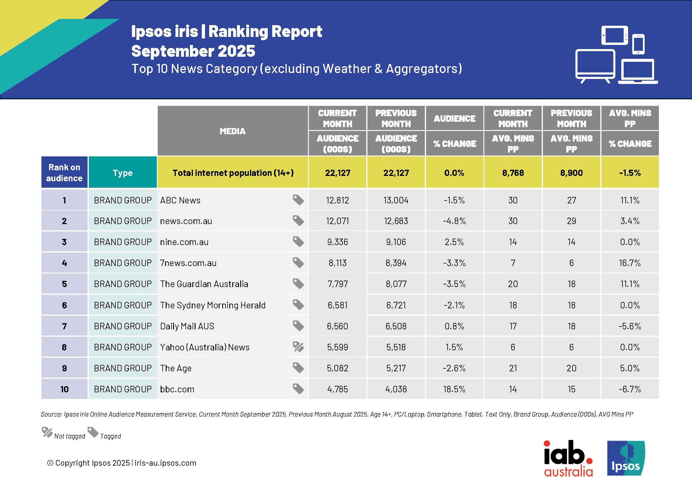 As a result, the Ipsos iris ranking of top news digital sites shows ABC News at number one in audience with 12,812 – a decrease of -1.15 per cent.