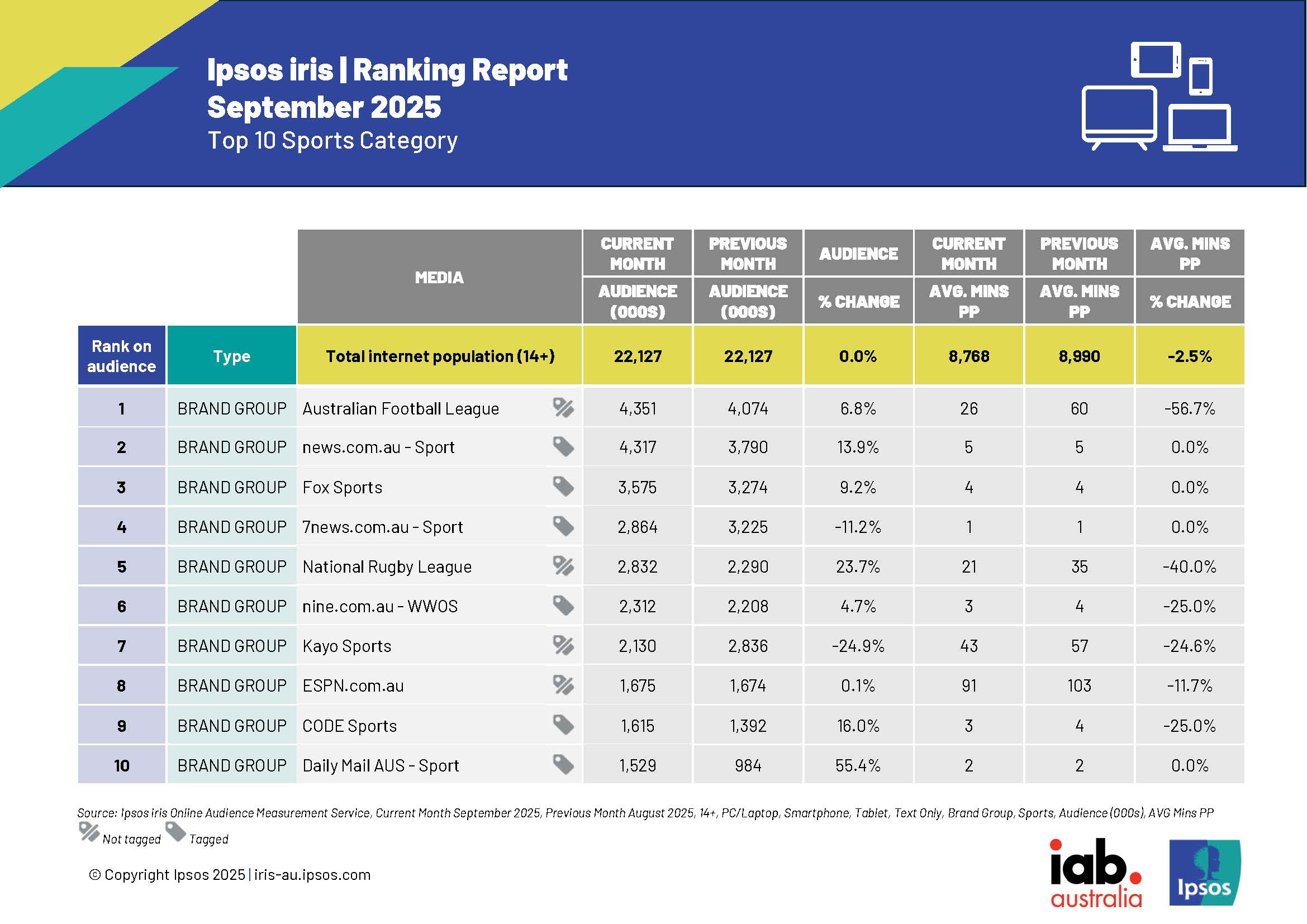 More than six in ten Australians, or 14.06 million people aged 14+, visited a sports website or app in September as cliff-hanger AFL, NRL and NRLW finals captured national attention, according to the latest Ipsos iris data.