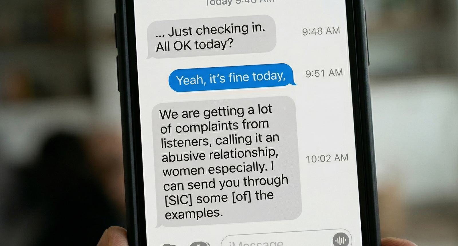 An AI recreation of an alleged SMS exchange between Jackie and senior management about Kyle’s behaviour.