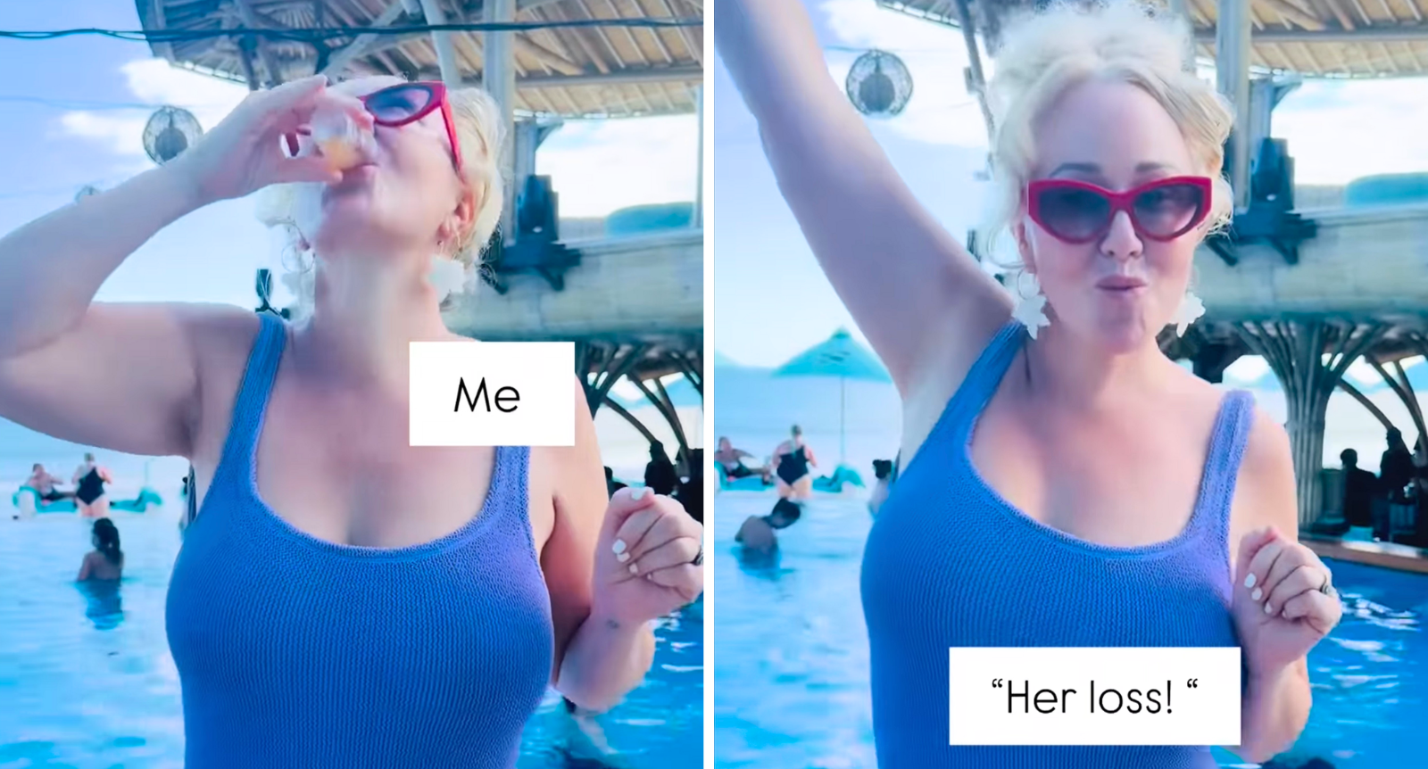 Posting about what she says happened, the journalist, who is also a mum of five, and co-founder of Run to the Sun fashion store, is seen dancing by a pool, and performing a cheers to camera.