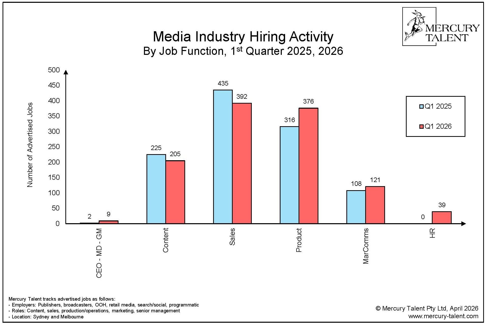 While commercial hiring softened, product and operations was the strongest-performing category. Roles in that area rose 6.3 per cent year-on-year to 336 and now account for 32 per cent of all media hiring, up from 24 per cent two years ago.