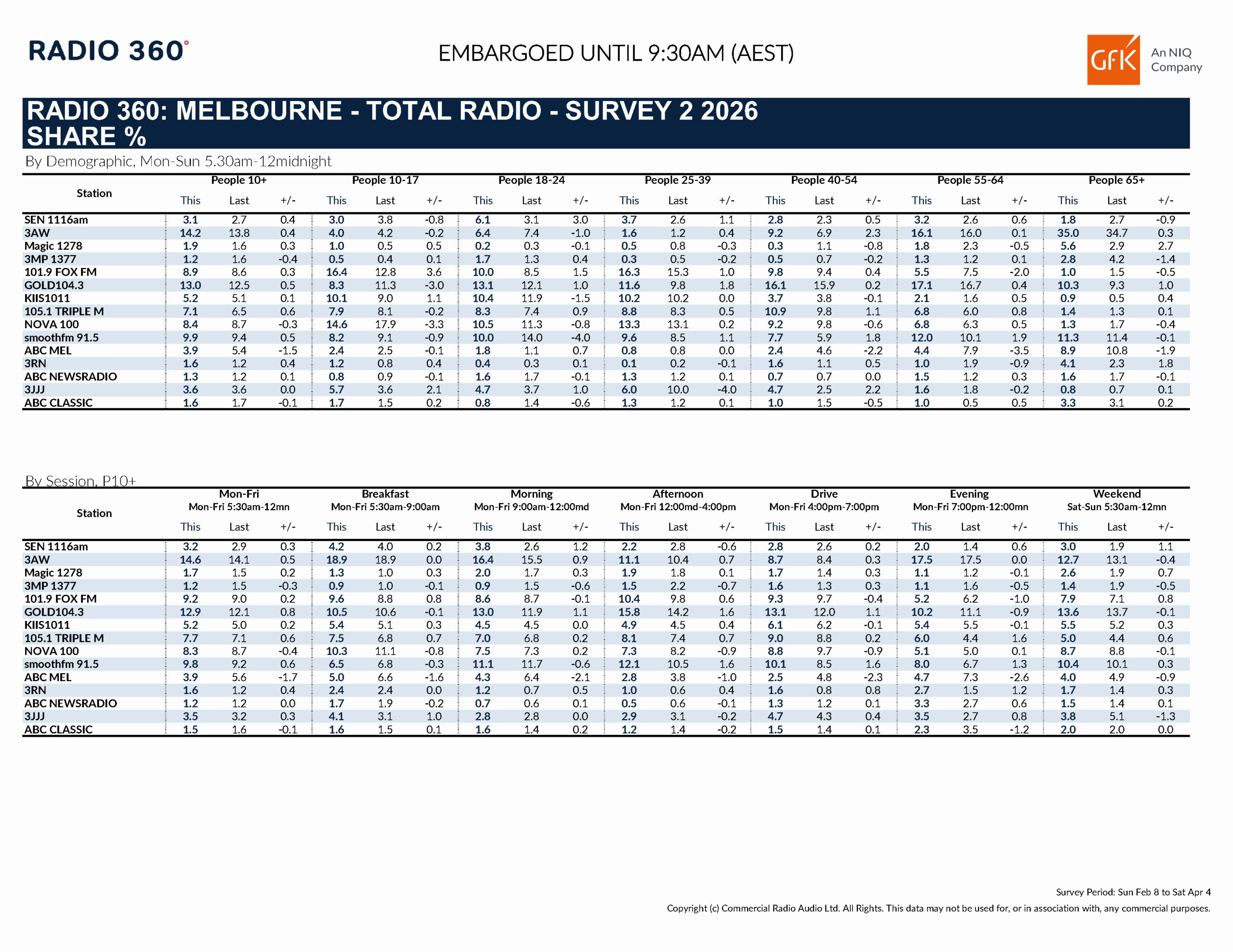 ![Melbourne Radio Ratings Survey 2, 2026. [click to expand.]](https://images-r2.thebrag.com/mw/uploads/2026/04/GfK_RADIO-360_Radio-Ratings-Report-Melbourne_Survey-2-2026_page2-1024x791.png)