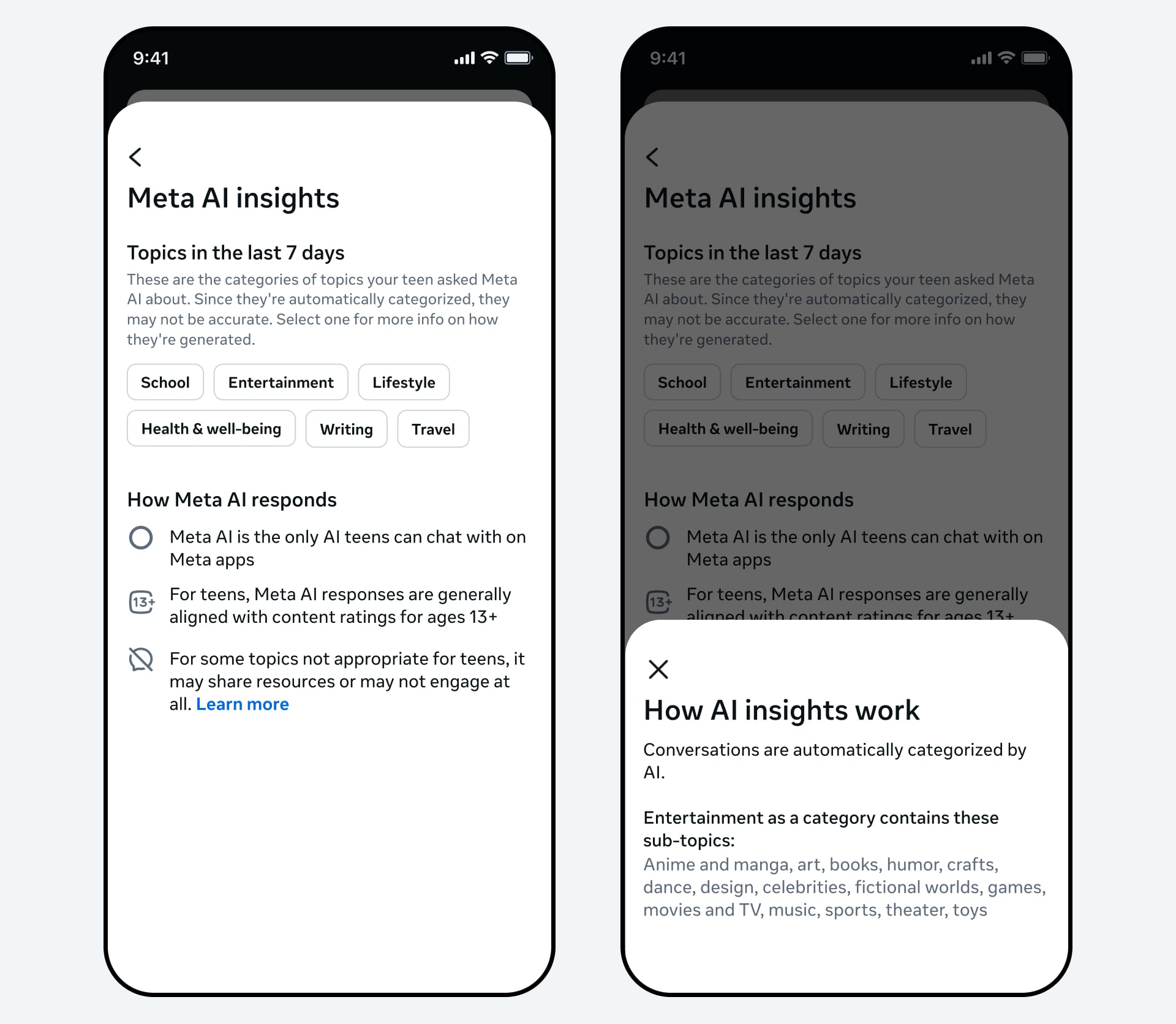Parents will be able to view broad topic areas their teen has asked Meta AI about in a specific app. These may include school, entertainment, lifestyle, travel, writing, and health and wellbeing.