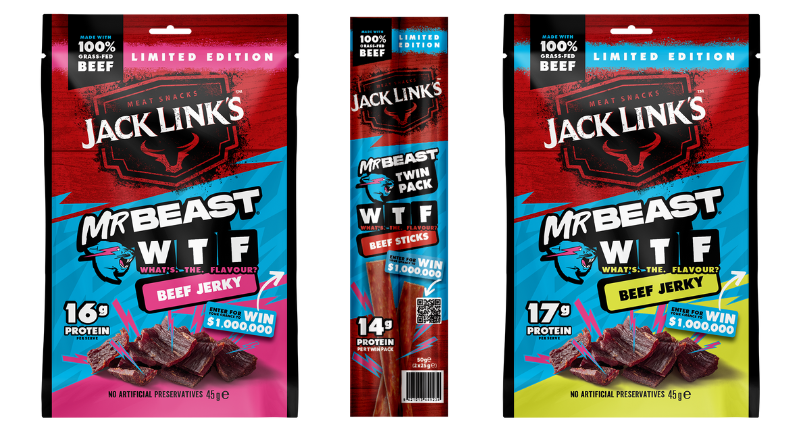 Meat snack brand Jack Link’s has partnered with content creator MrBeast to launch three Grass Fed Beef W.T.F! (What’s. The. Flavour?!) products across Australia and New Zealand.