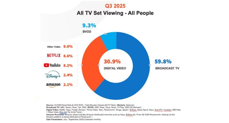 Across July to September, broadcast TV accounted for 59.8% of viewing among total people. Total BVOD sat at 9.3%, while digital video – including Netflix, YouTube, Disney+, and Prime Video – held steady at 30.9%.
