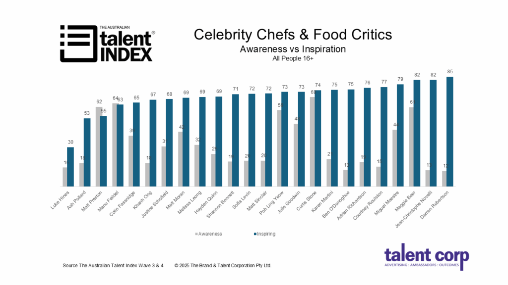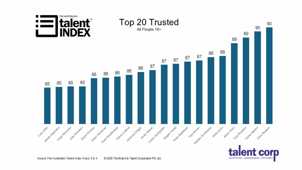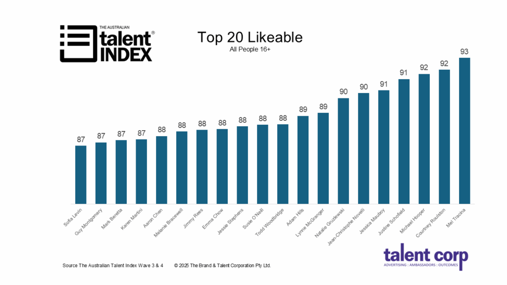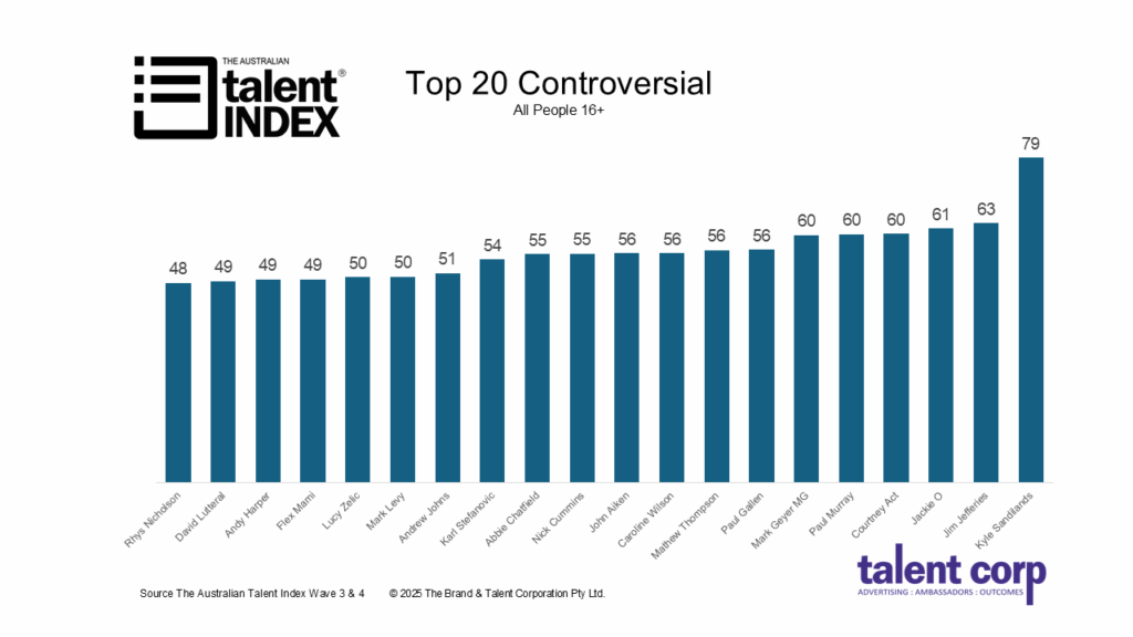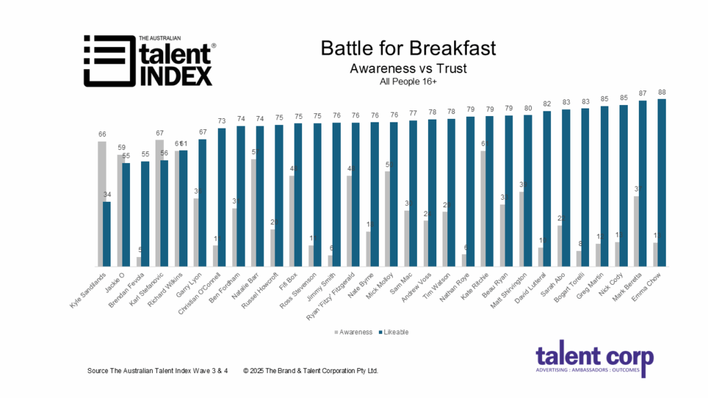 “The listeners of Kyle Sandilands love Kyle Sandilands,” Noakes said. “But there’s a big cohort outside of those listeners that hate him. Our index takes in that negative sentiment and combines it with the positive sentiment to get the ranking. And if you’re a marketer and you don’t want to disenfranchise a certain cohort, then that’s the Talent Index comes into play. Just a likability or a rating is not really a great measurement for a celebrity if you don’t want to disenfranchise a brand, a cohort, a demographic.”