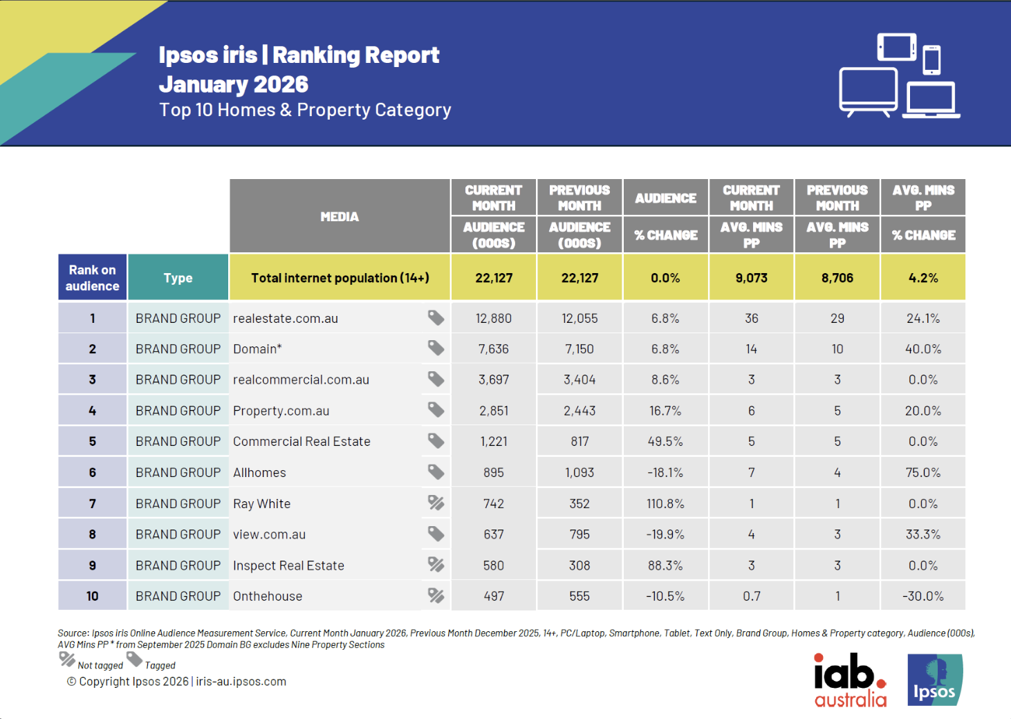 More than 15 million Australians flocked to homes and property websites and apps at the start of 2026, according to Ipsos iris data released today.