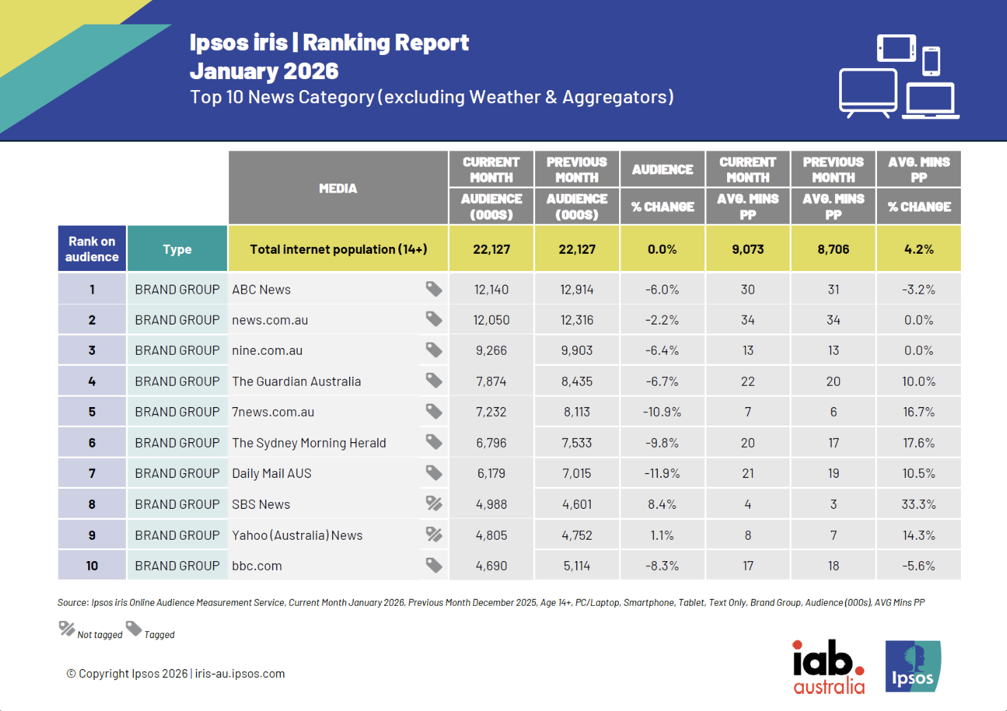 Ipsos iris, endorsed by IAB Australia as the country’s digital audience measurement currency, reported that 22.127 million Australians aged 14+ used the internet in January, spending an average 5.06 hours daily online, up 5.1% year-on-year.