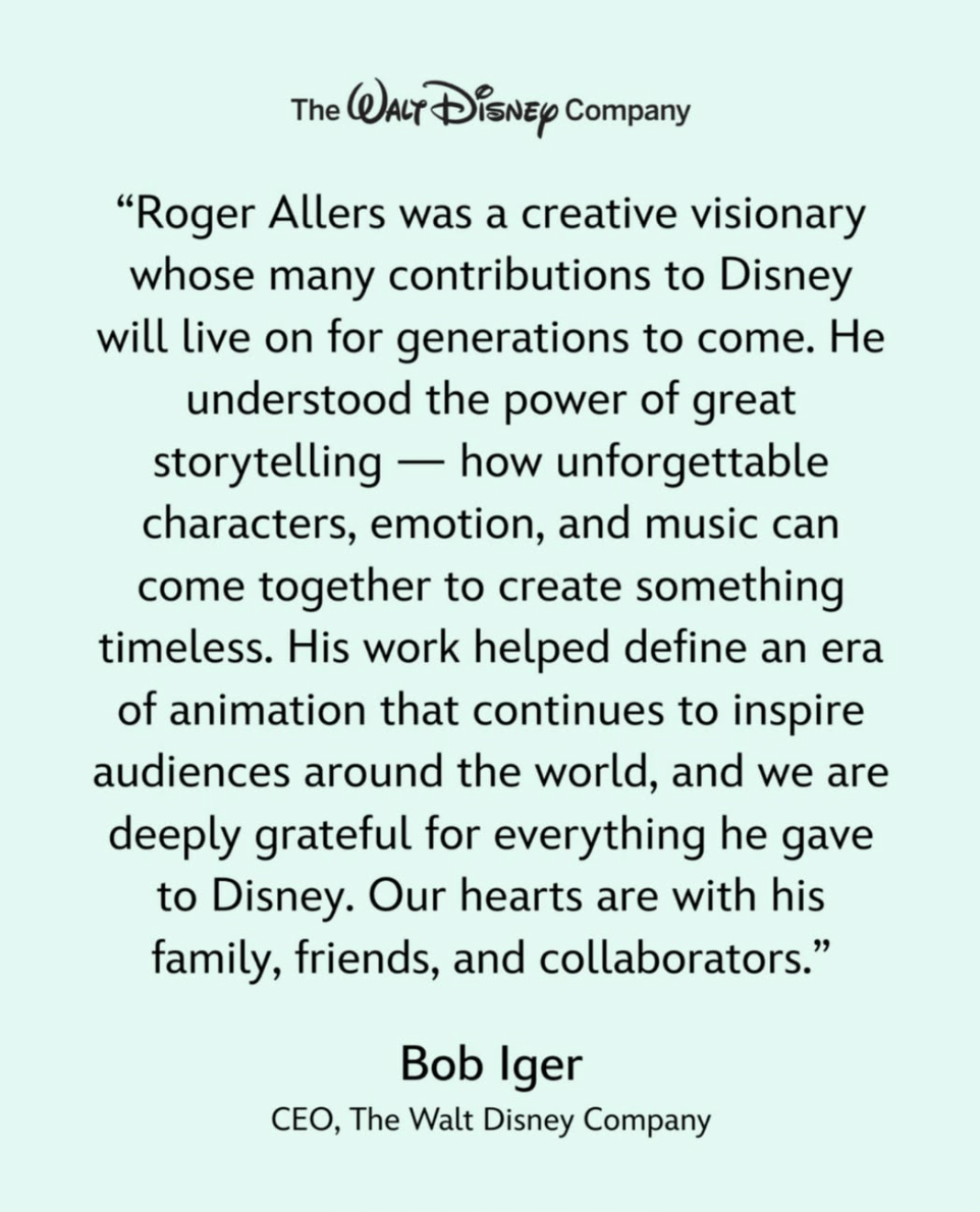 “Roger Allers was a creative visionary whose many contributions to Disney will live on for generations to come. He understood the power of great storytelling – how unforgettable characters, emotion, and music can come together to create something timeless.”