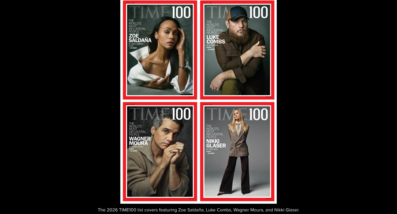 The issue has four worldwide covers, each highlighting a member of the TIME100: actor Zoe Saldaña, comedian Nikki Glaser, actor Wagner Moura, and singer-songwriter Luke Combs.
