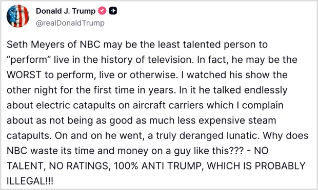 The pattern isn’t new. Earlier this year, Trump labelled Meyers’ content “probably illegal,” writing: