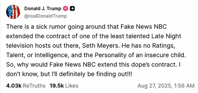 NBC’s Late Night with Seth Meyers has long treated Donald Trump as a running punchline, but the former president has turned the tables again, using his social platforms to call the host “no talent,” a “dope,” and someone “suffering from an incurable case of Trump Derangement Syndrome.”