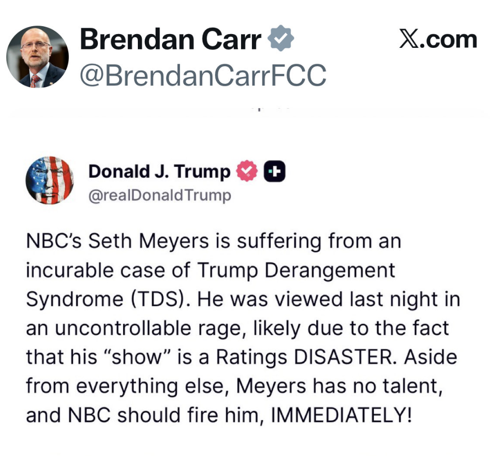 The post was quickly reposted by Federal Communications Commission chair Brendan Carr.