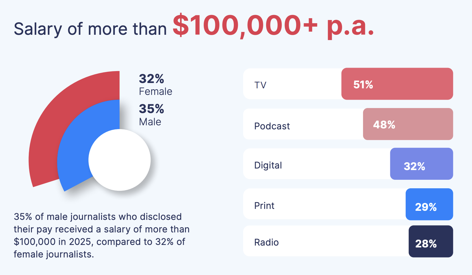 Journalists working in publicly funded or government-funded media organisations were among the highest-paid, with 51% earning $100,000 or more annually.