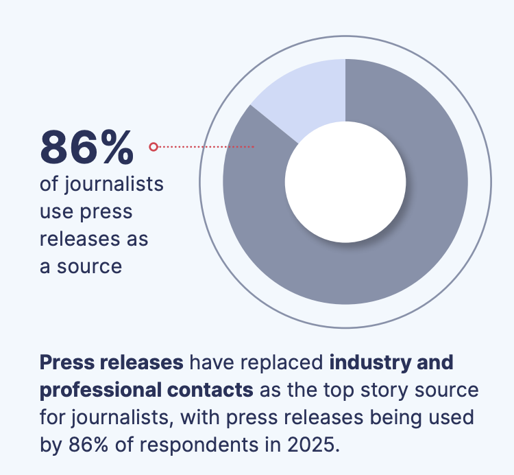 Press releases are now the most commonly used source for journalists, with 86% of respondents relying on them in 2025. This places them ahead of traditional industry and professional contacts, which historically dominated newsroom sourcing.