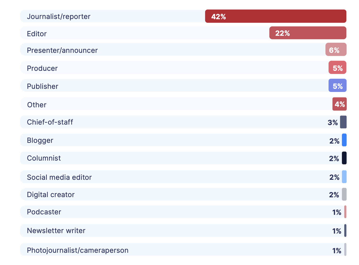 The most common salary band in 2025 sat between $60,000 and $79,999, followed by $80,000 to $99,999. The proportion of journalists earning more than $100,000 rose slightly, from 31% in 2024 to 33% in 2025.