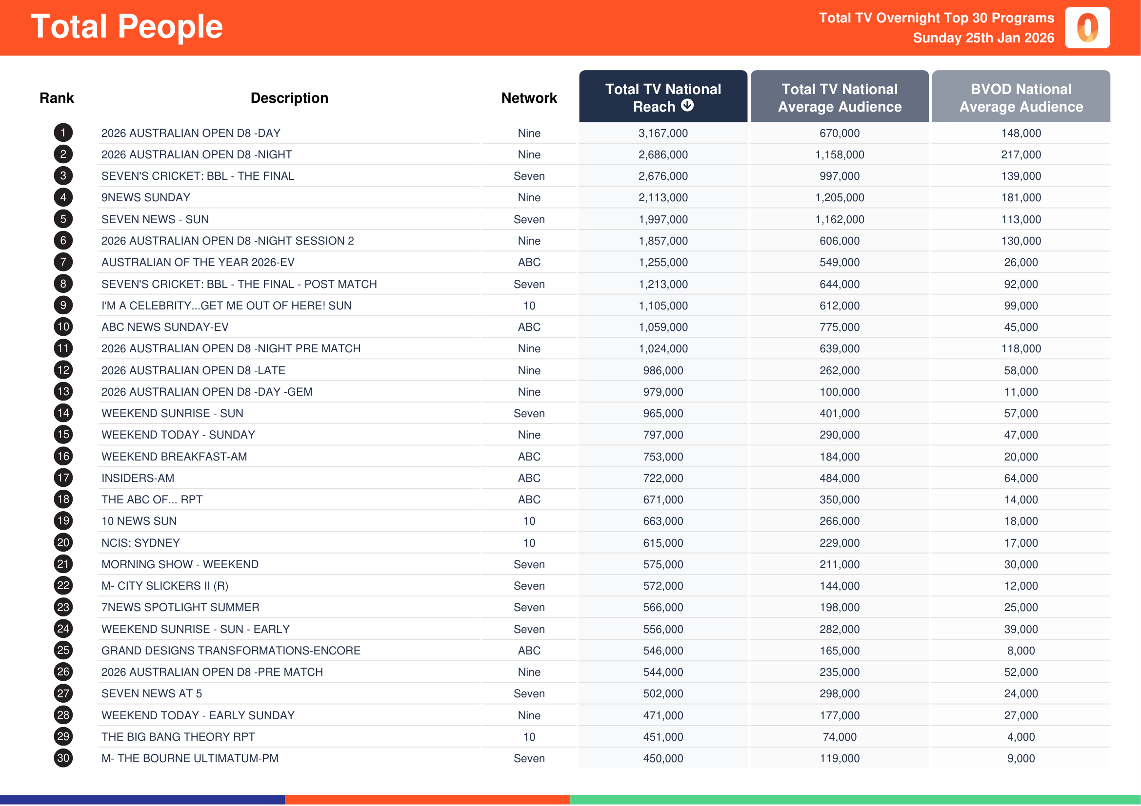 Nine’s 2026 Australian Open D8 -Day recorded a total TV national reach of 3,167,000, a total TV national audience of 670,000 and a BVOD audience of 148,000.