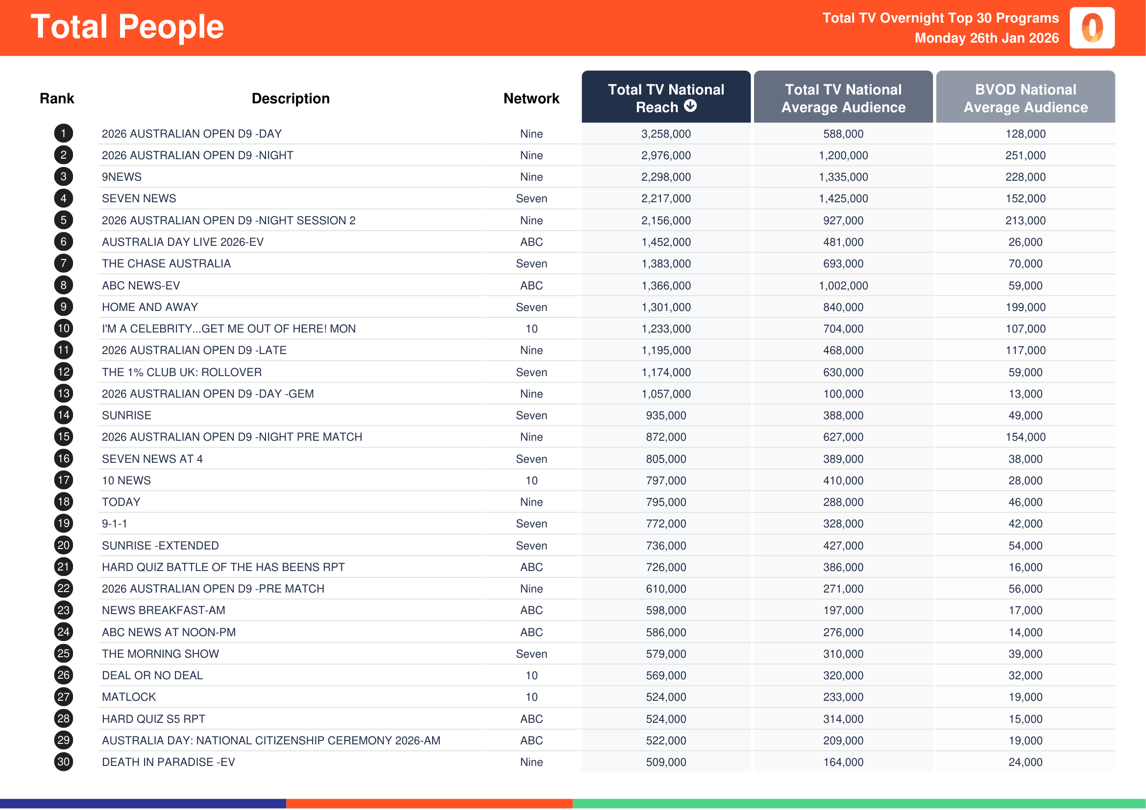 Nine’s 2026 Australian Open D9 -Day recorded a total TV national reach of 3,258,000, a total TV national audience of 588,000 and a BVOD audience of 128,000.