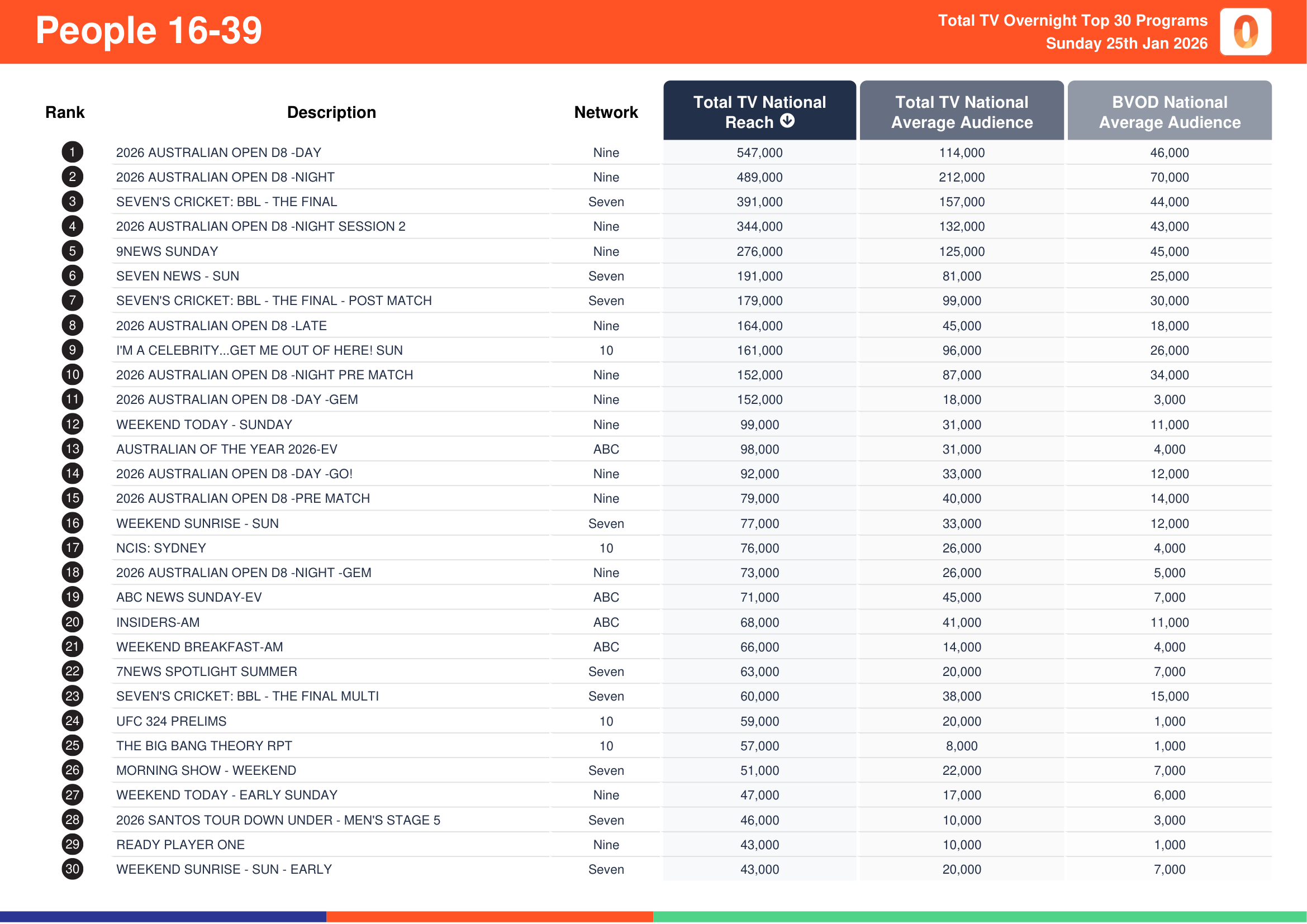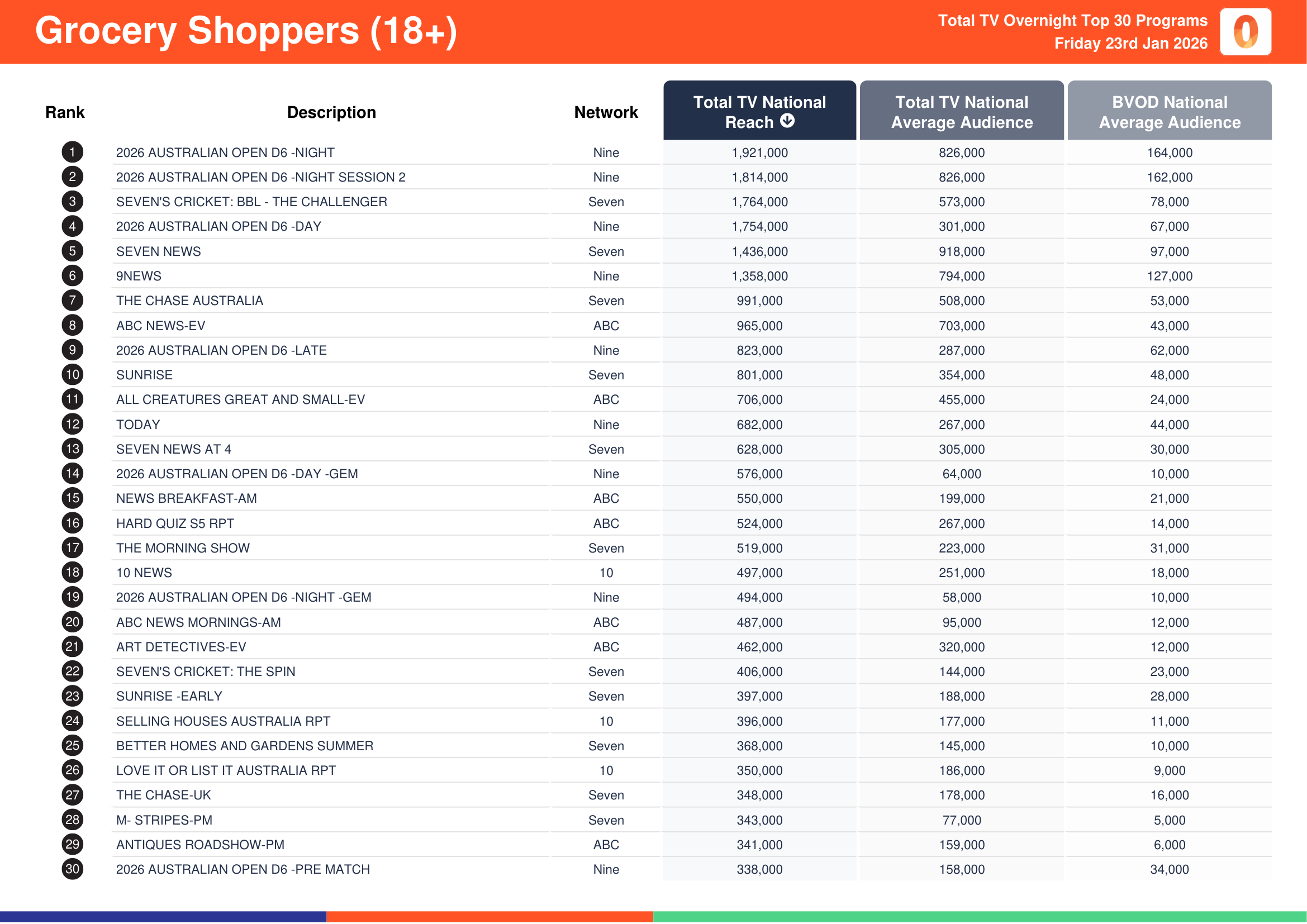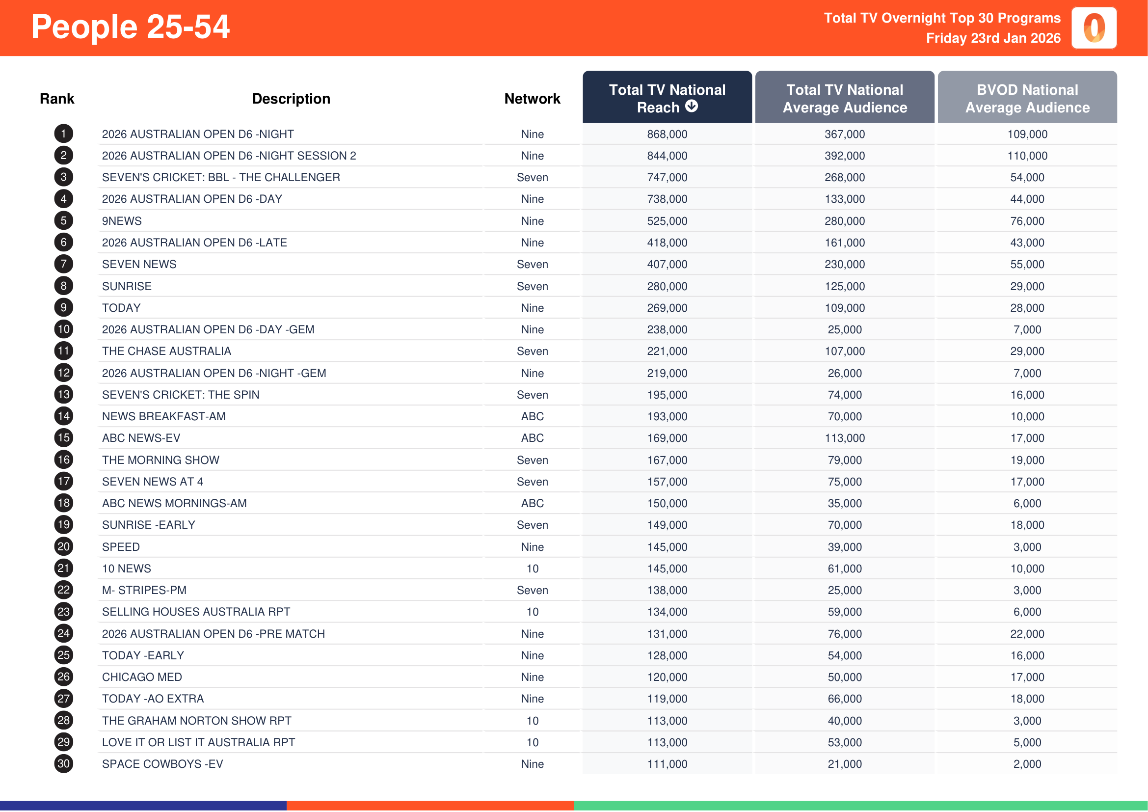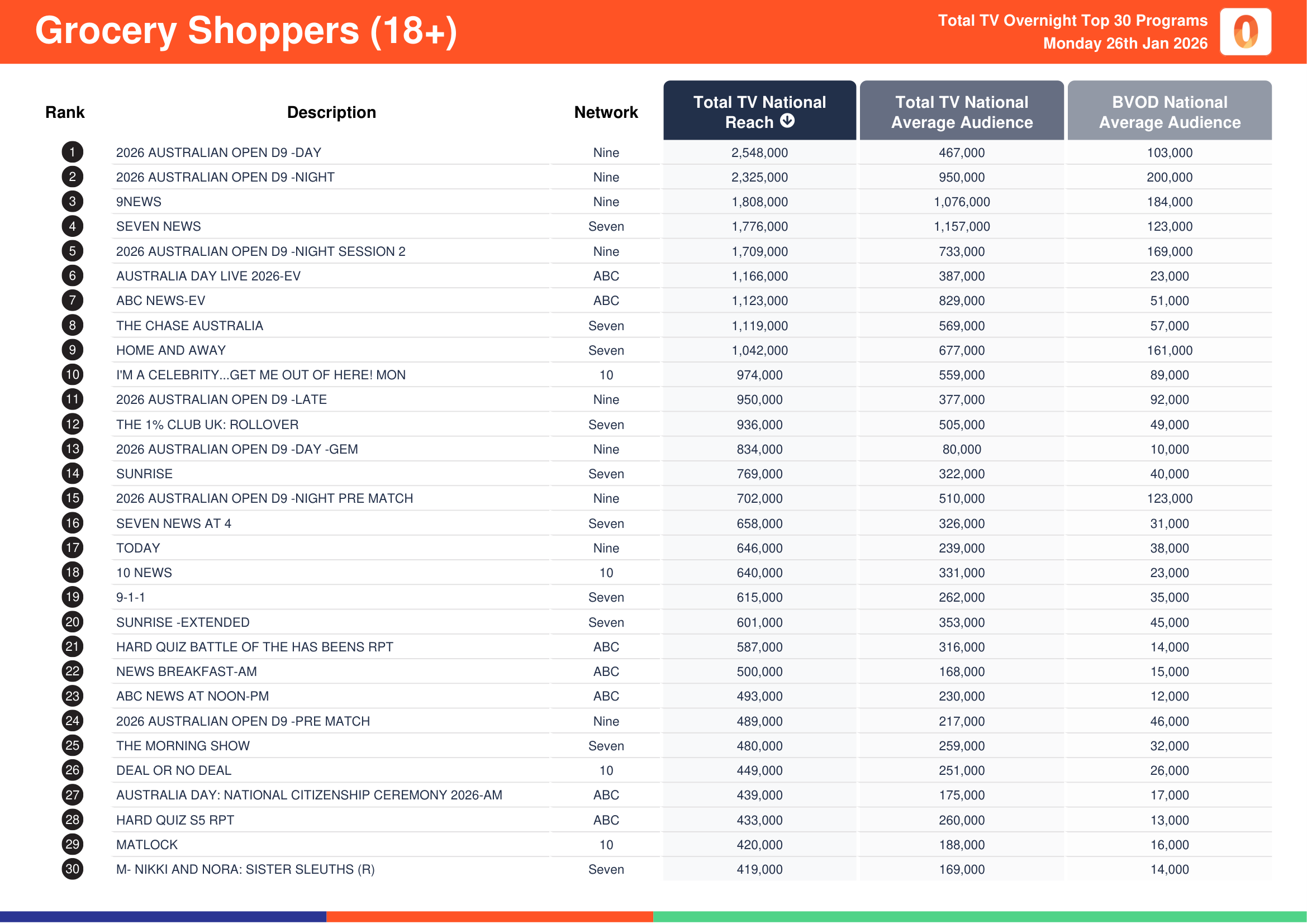 Nine’s 2026 Australian Open D7 -Night Session 2 recorded a total TV national reach of 2,112,000, a total TV national audience of 863,000 and a BVOD audience of 179,000.