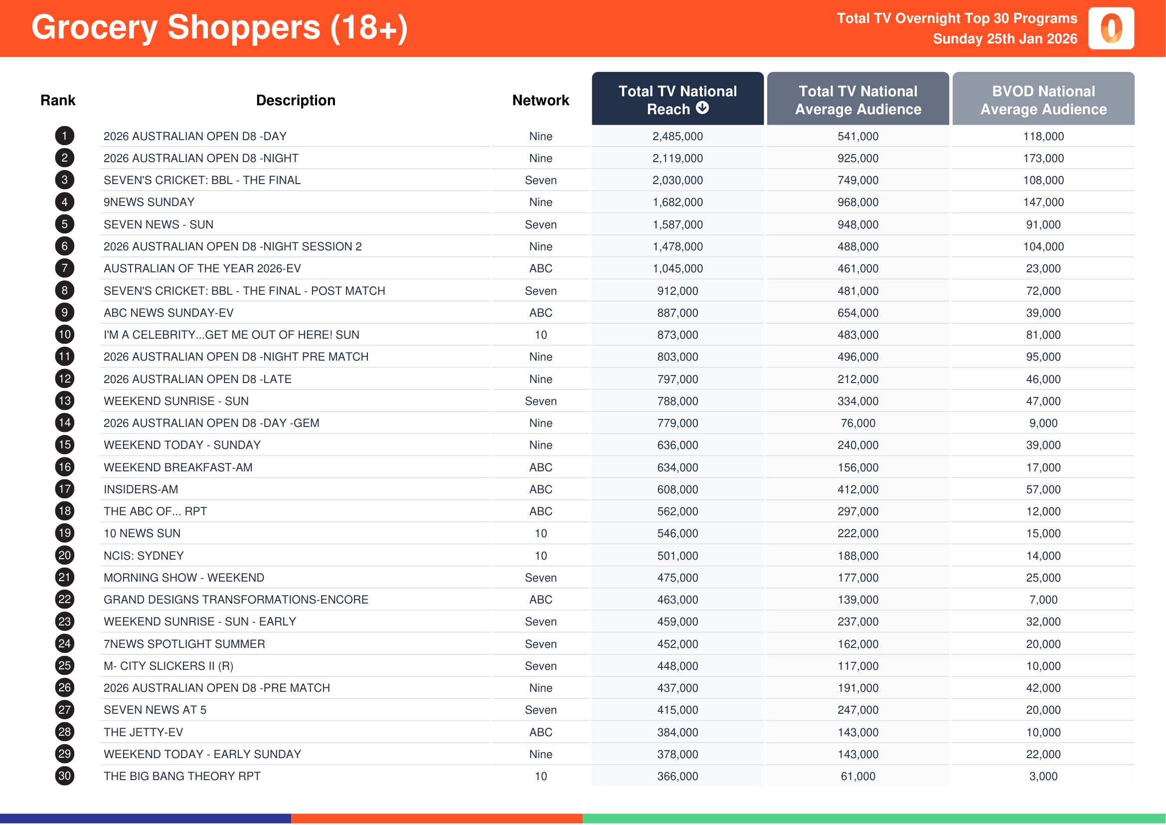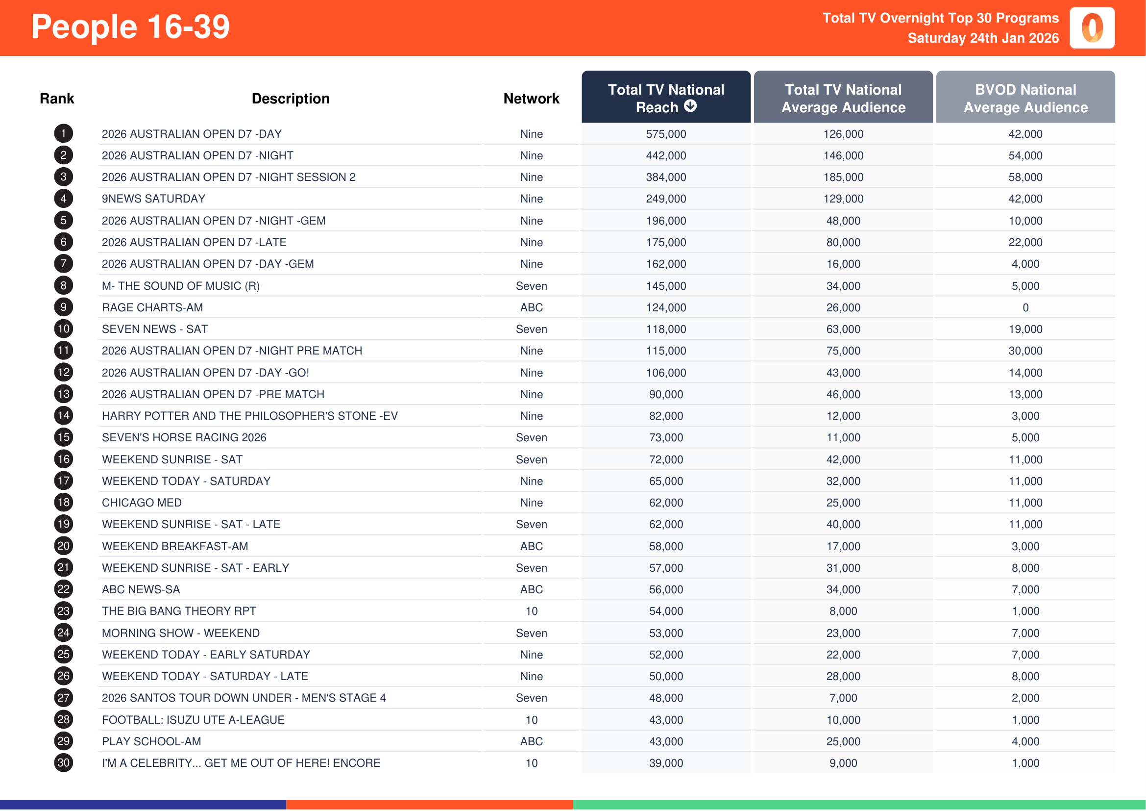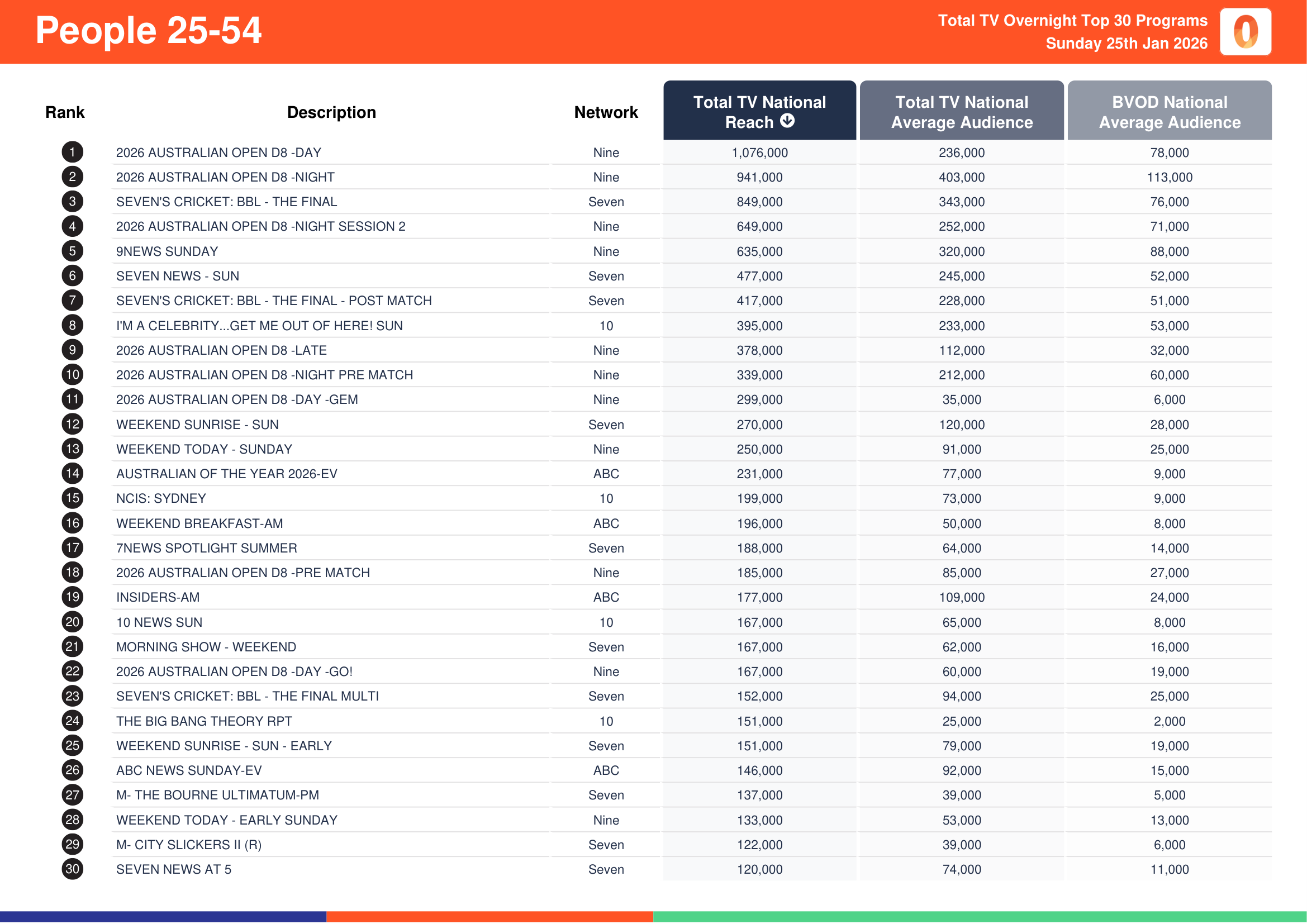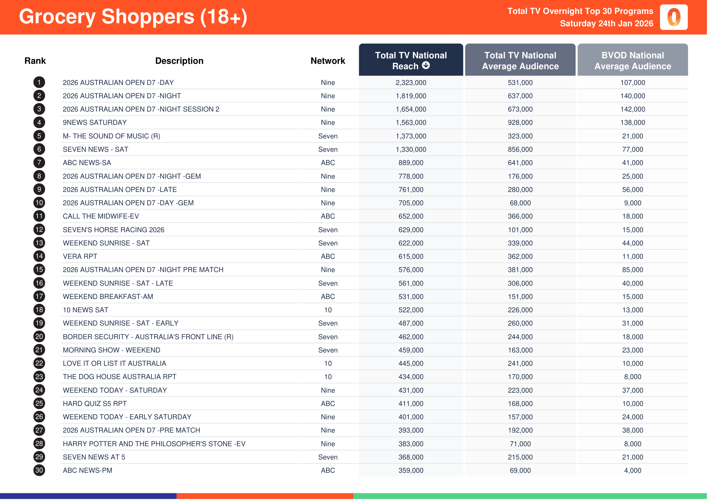 Nine’s 2026 Australian Open D7 -Night Session 2 recorded a total TV national reach of 2,112,000, a total TV national audience of 863,000 and a BVOD audience of 179,000.