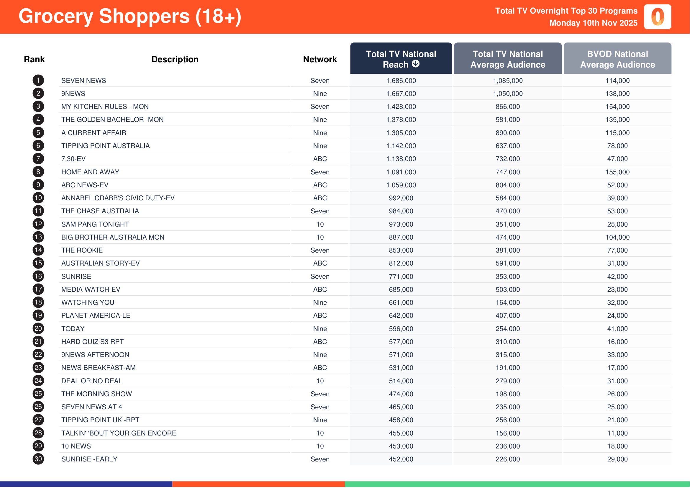 Nine’s The Golden Bachelor recorded a total TV national reach of 1,692,000, a total TV national audience of 708,000 and a BVOD audience of 165,000.
