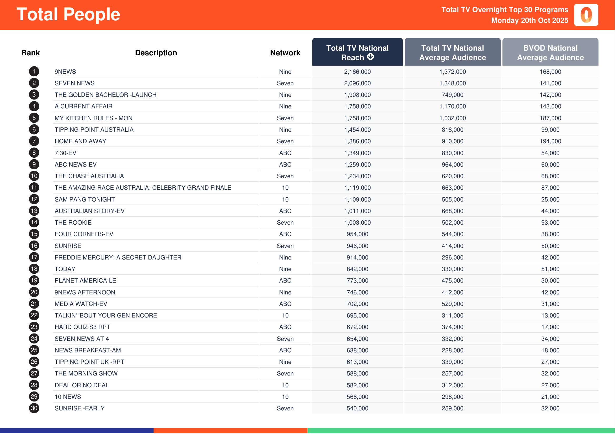 Nine’s 9News recorded a total TV national reach of 2,166,000, a total TV national audience of 1,372,000 and a BVOD audience of 168,000.