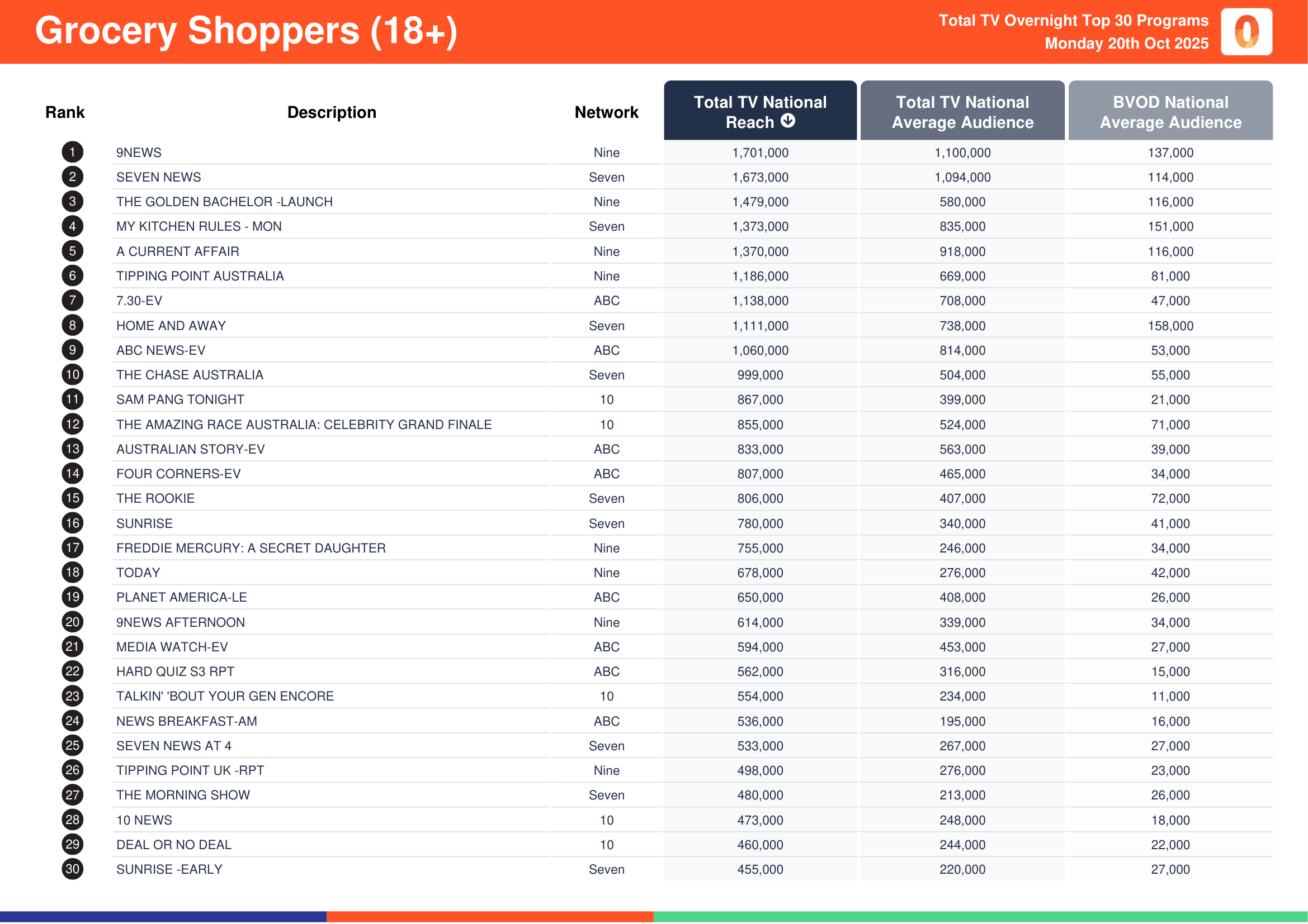Seven’s My Kitchen Rules recorded a total TV national reach of 1,758,000, a total TV national audience of 1,032,000 and a BVOD audience of 187,000.