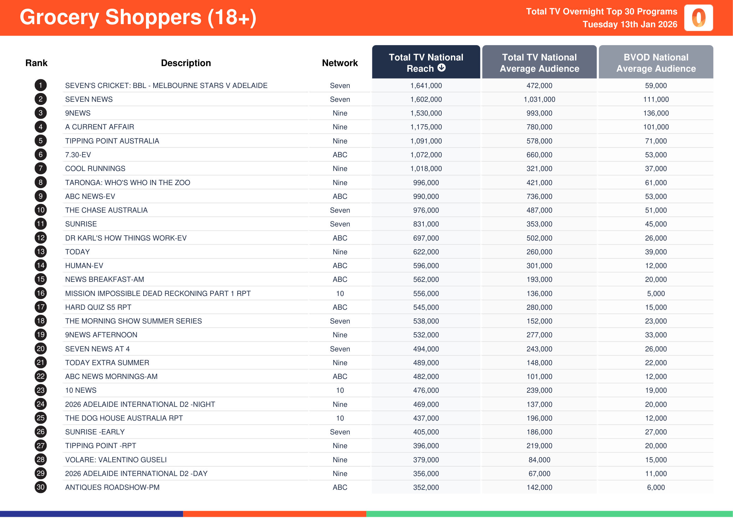 Seven’s Seven News recorded a total TV national reach of 1,999,000, a total TV national audience of 1,273,000 and a BVOD audience of 138,000.