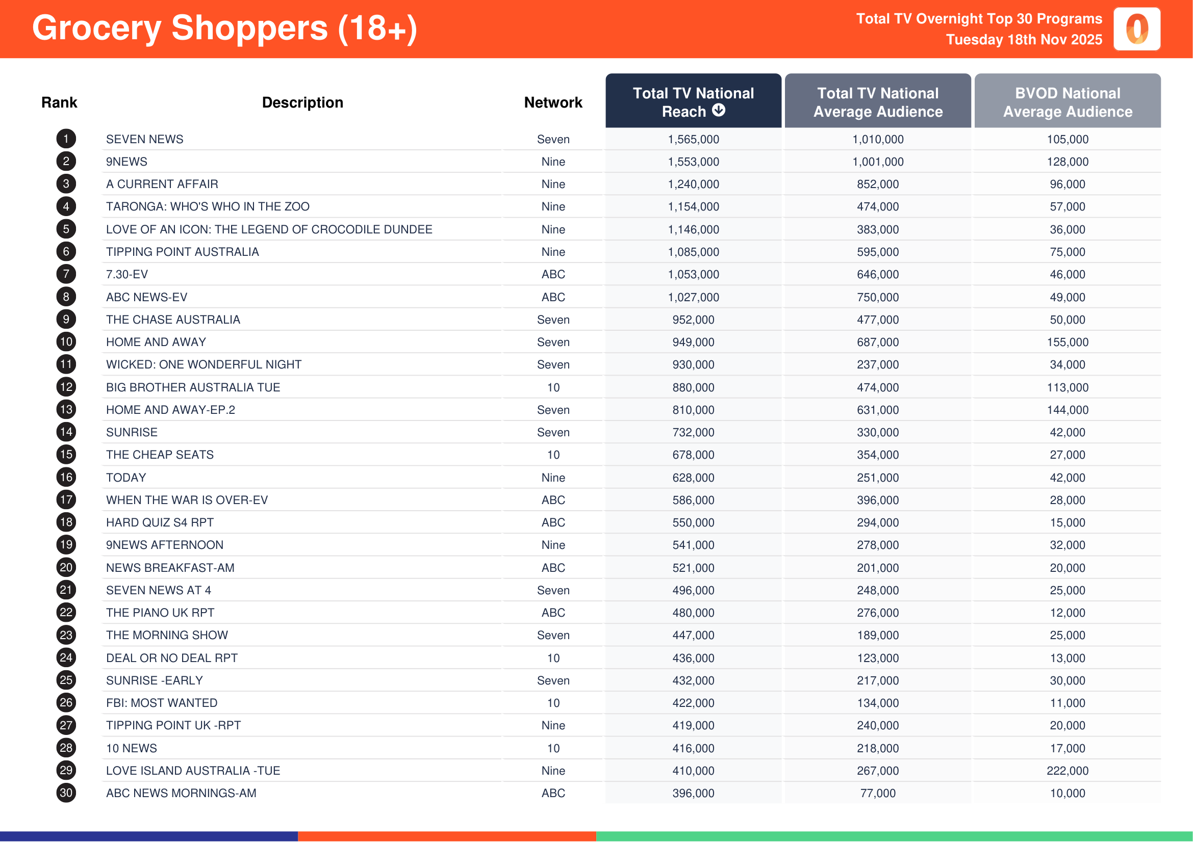 Seven’s Seven News recorded a total TV national reach of 1,911,000, a total TV national audience of 1,223,000 and a BVOD audience of 130,000.