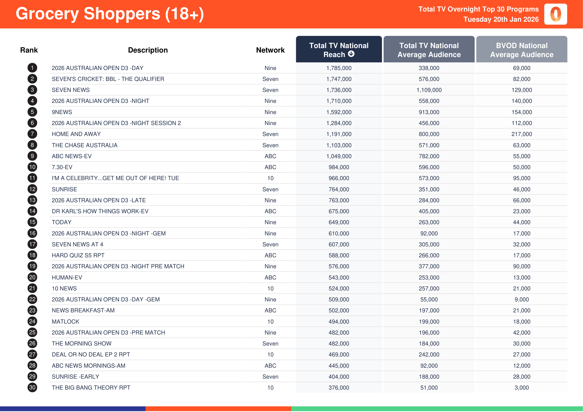 Seven’s Cricket: BBL – The Qualifier recorded a total TV national reach of 2,303,000, a total TV national audience of 769,000 and a BVOD audience of 105,000.