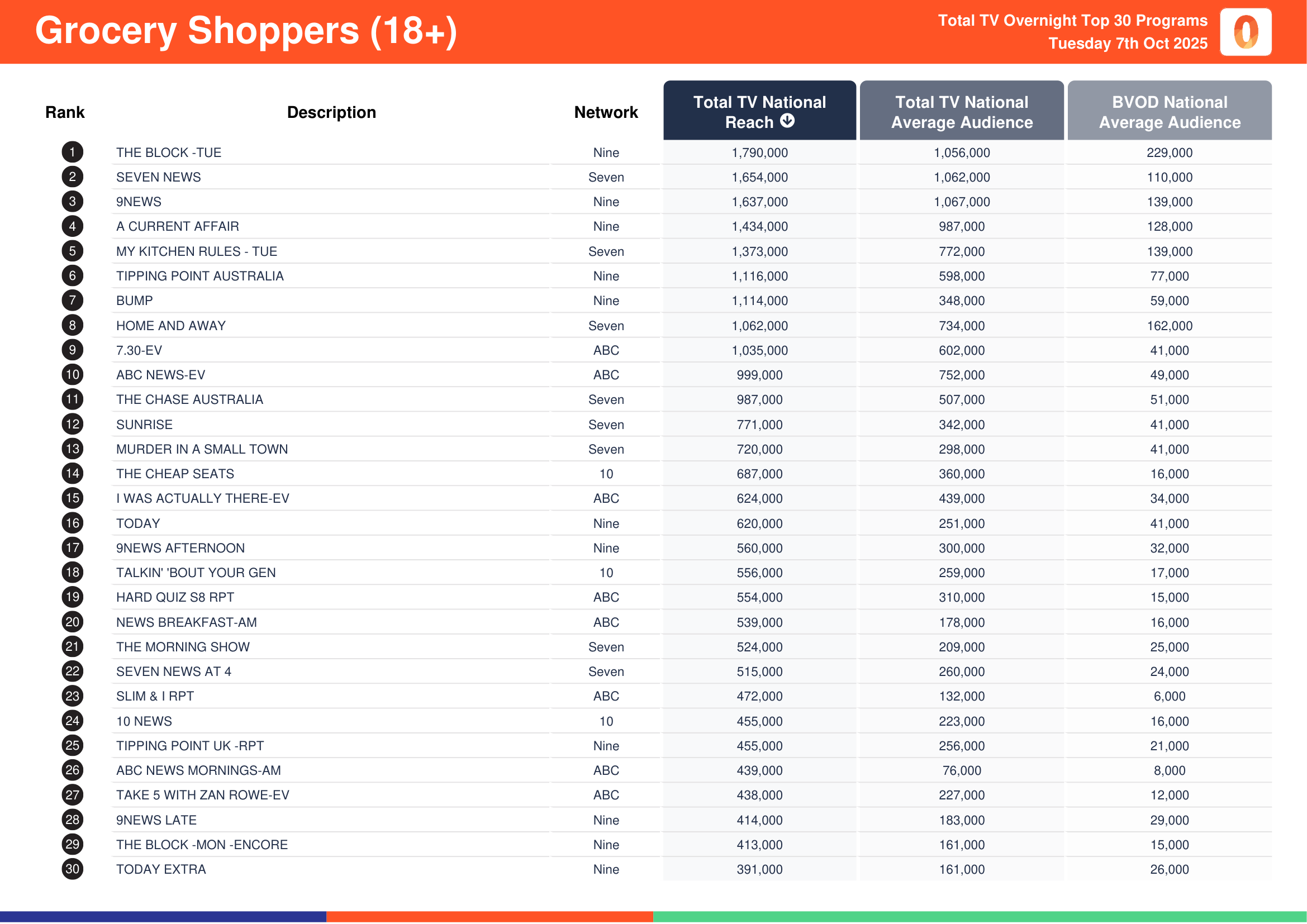 Nine’s The Block recorded a total TV national reach of 2,232,000, a total TV national audience of 1,307,000 and a BVOD audience of 282,000.