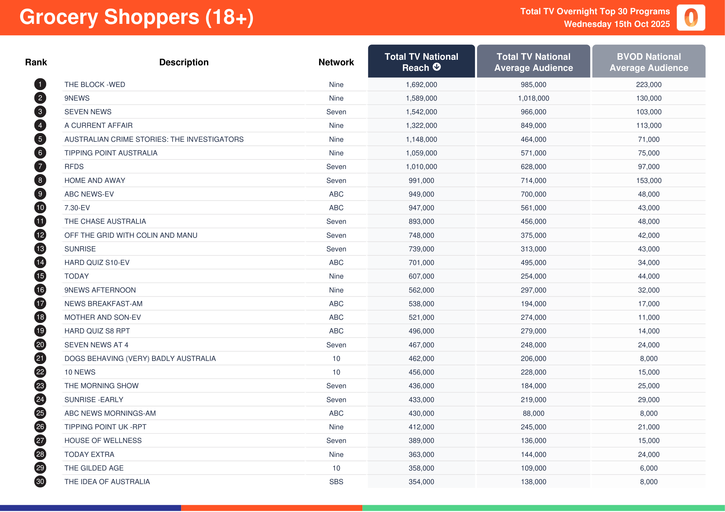 Nine’s The Block recorded a total TV national reach of 2,110,000, a total TV national audience of 1,218,000 and a BVOD audience of 275,000.