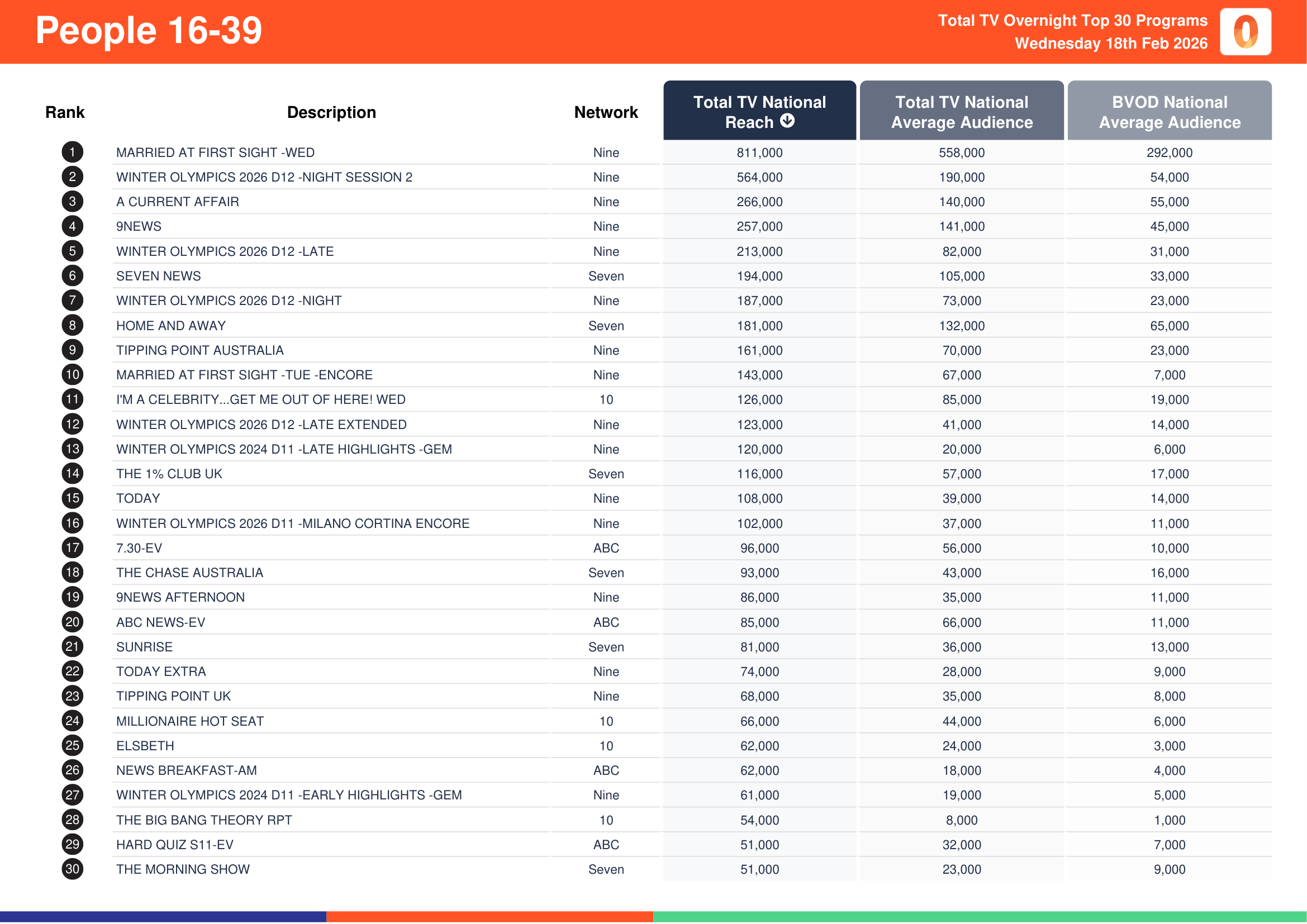 Nine’s Married At First Sight recorded a total TV national reach of 3,205,000, a total TV national audience of 2,010,000 and a BVOD audience of 740,000.