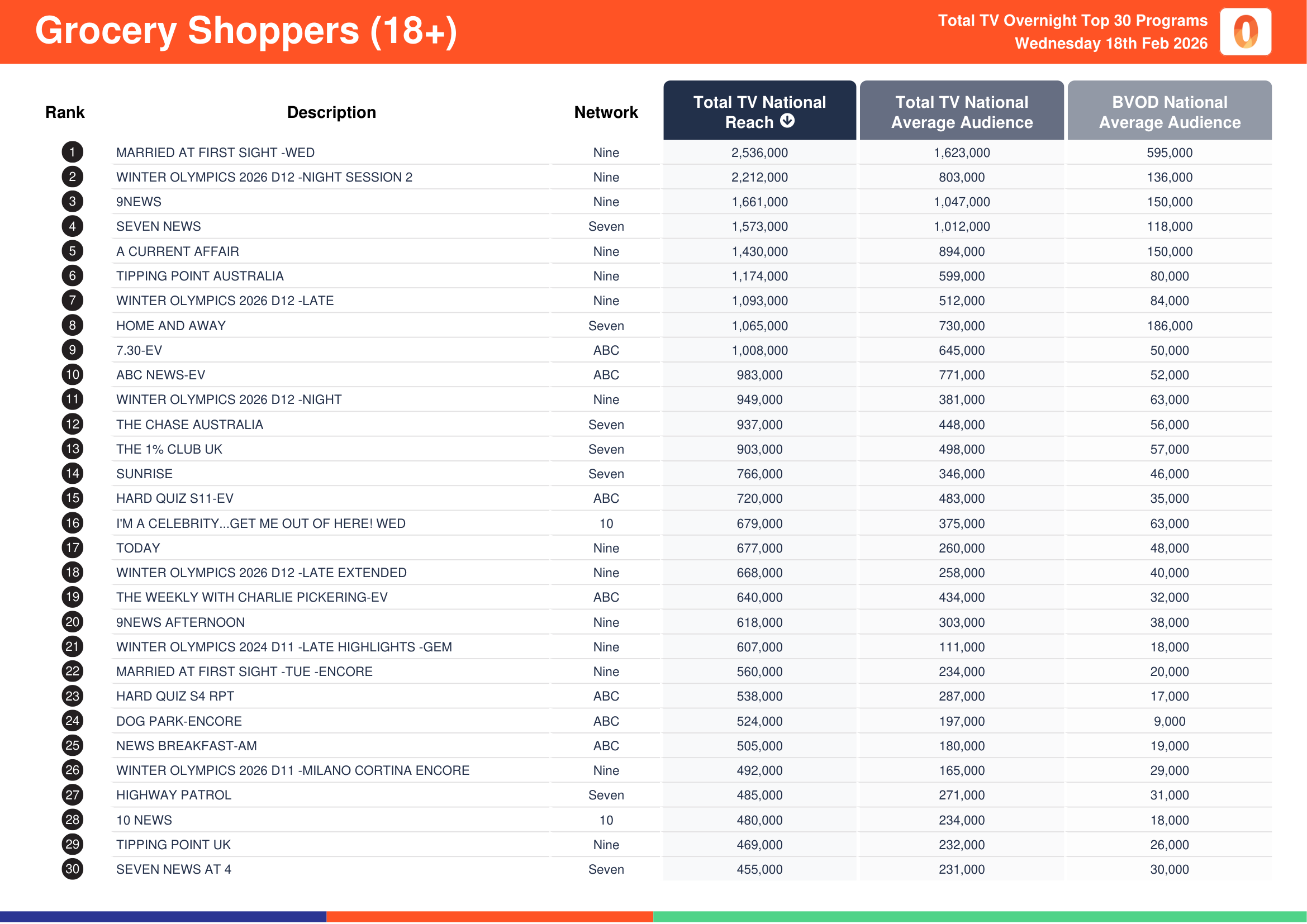 Nine’s Winter Olympics 2026 D12 -Night Session 2 recorded a total TV national reach of 2,761,000, a total TV national audience of 1,000,000 and a BVOD audience of 168,000.