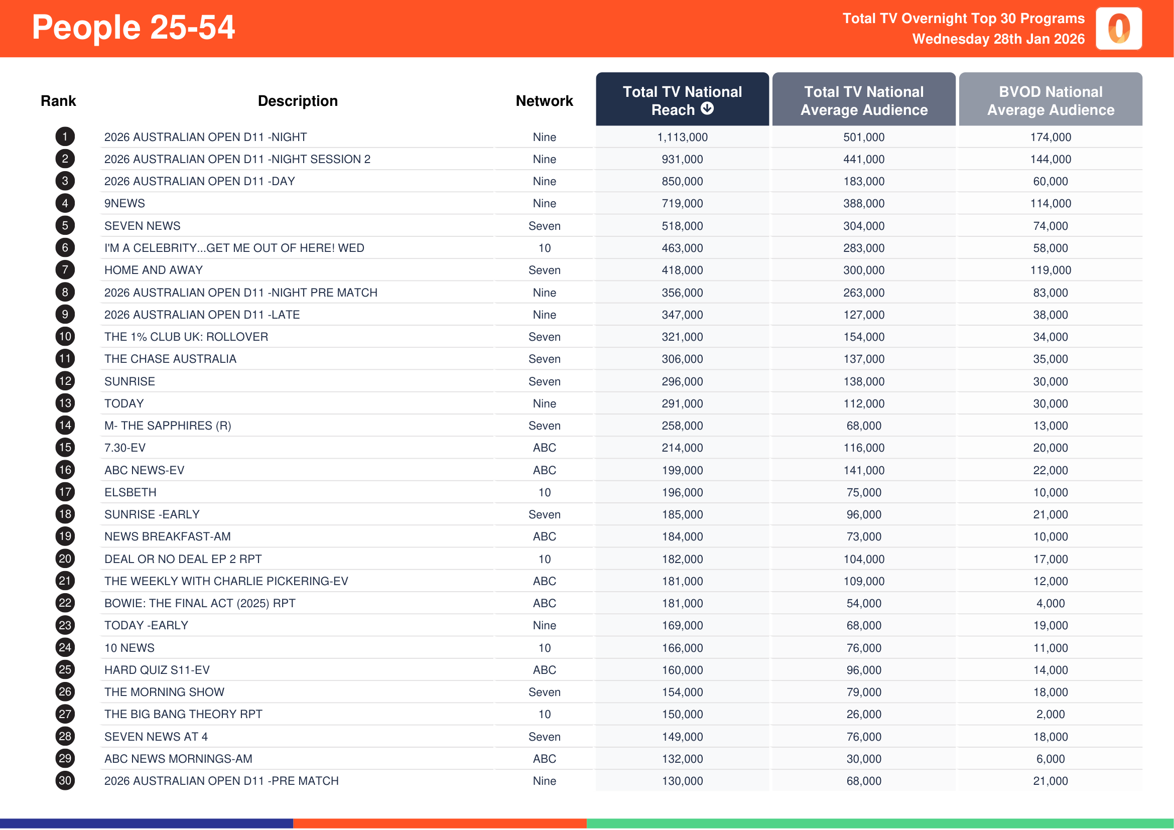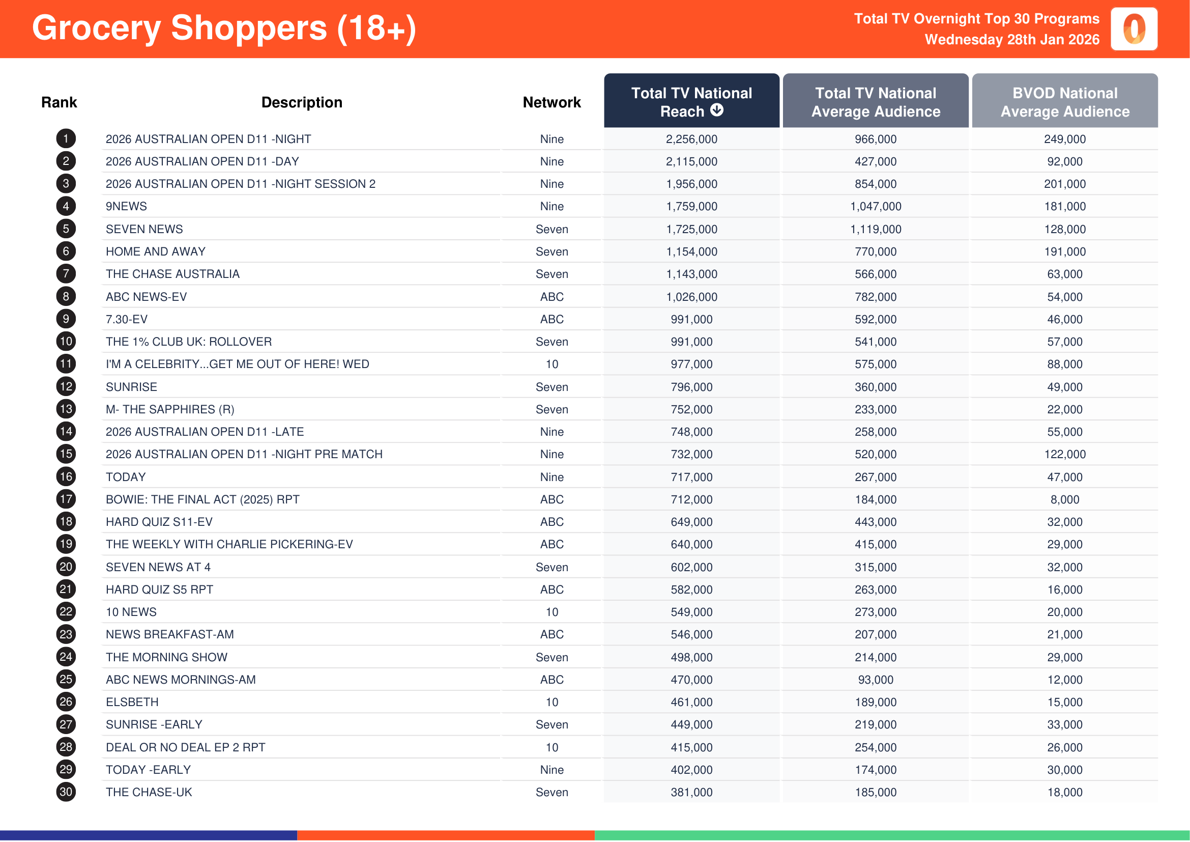 Nine’s 2026 Australian Open D11 -Night Session 2 recorded a total TV national reach of 2,504,000, a total TV national audience of 1,094,000 and a BVOD audience of 254,000.