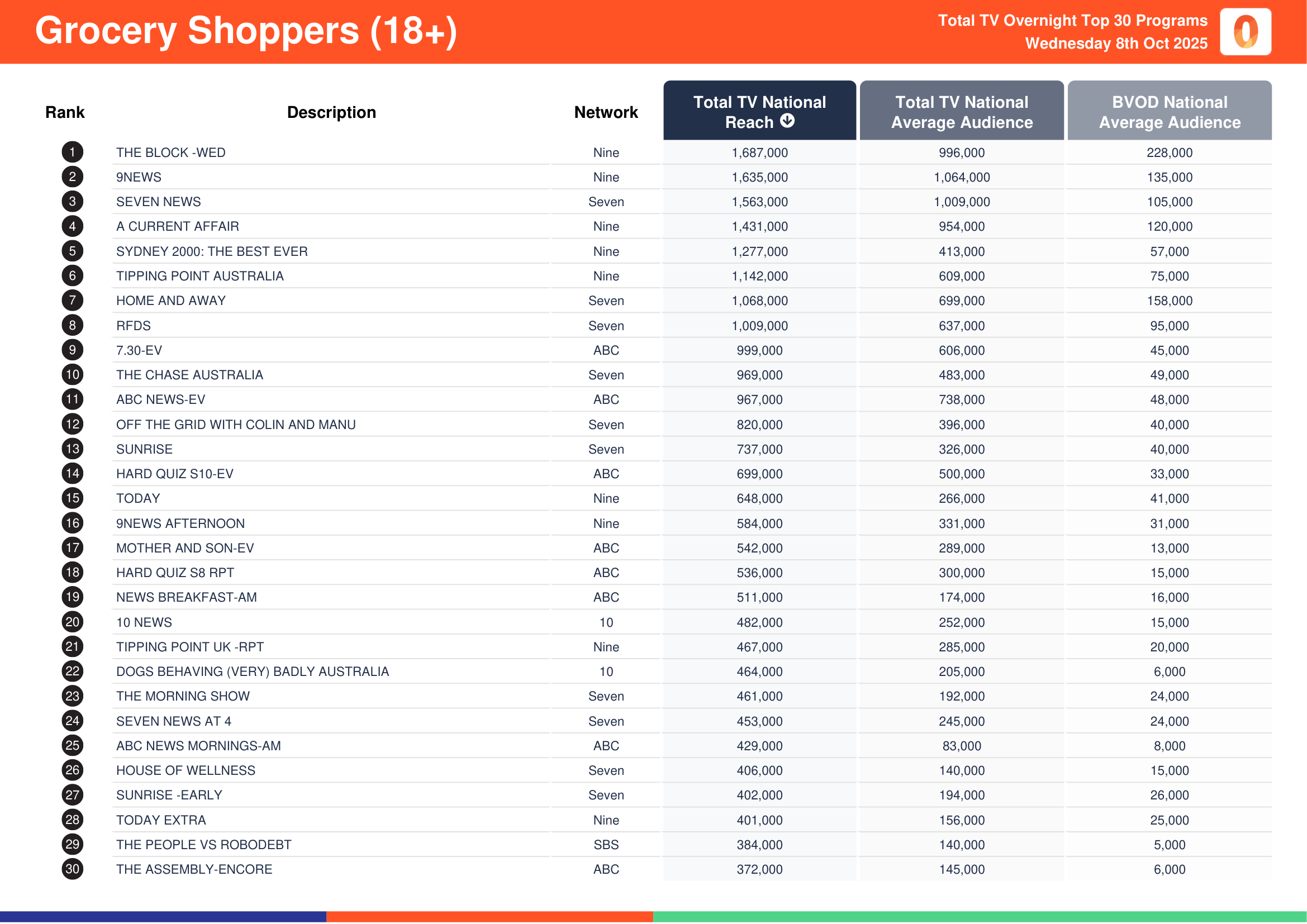 Nine’s The Block recorded a total TV national reach of 2,130,000, a total TV national audience of 1,251,000 and a BVOD audience of 282,000.