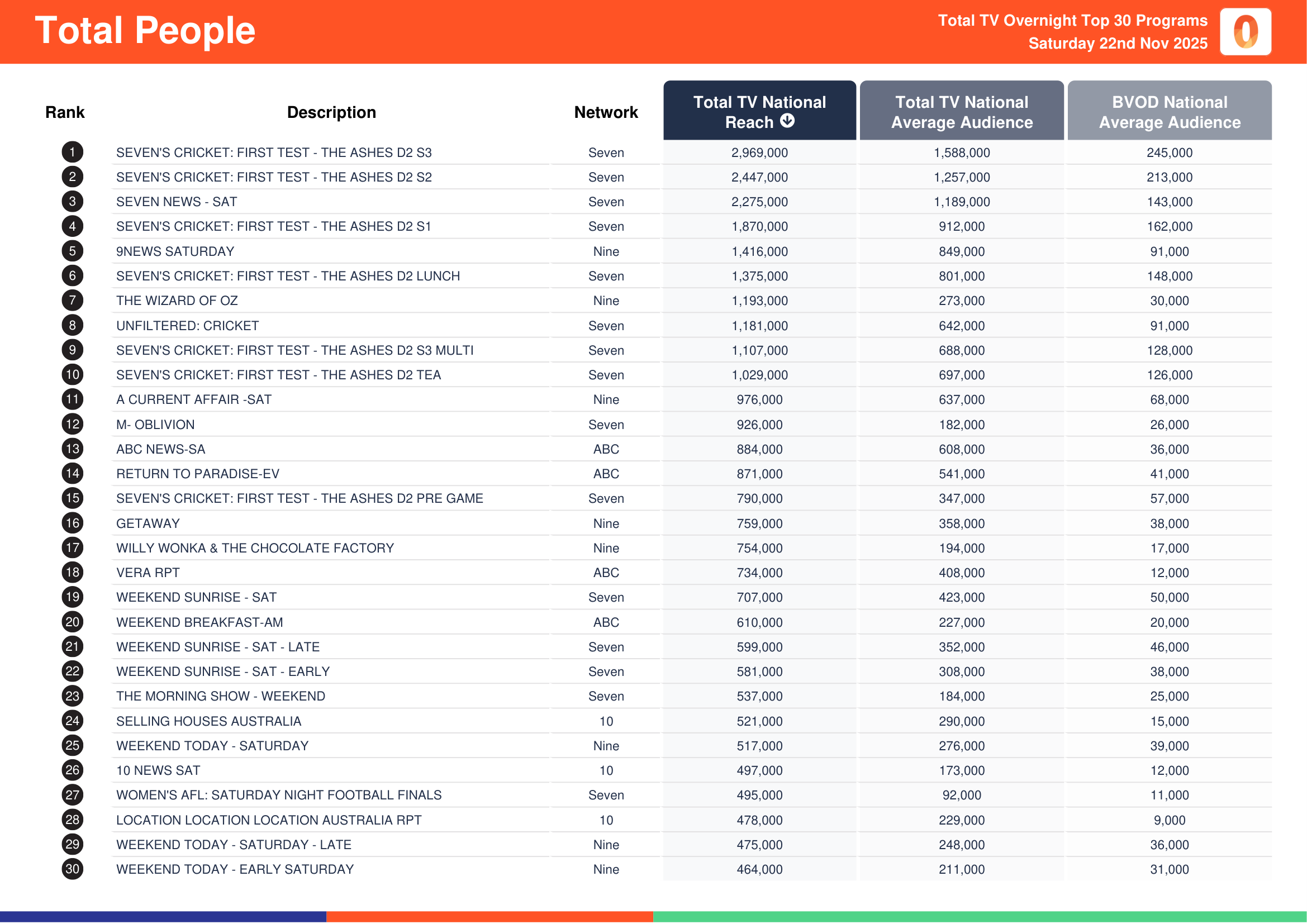 Seven Seven’s Cricket: First Test – The Ashes D2 S3 recorded a total TV national reach of 2,969,000, a total TV national audience of 1,588,000 and a BVOD audience of 245,000.